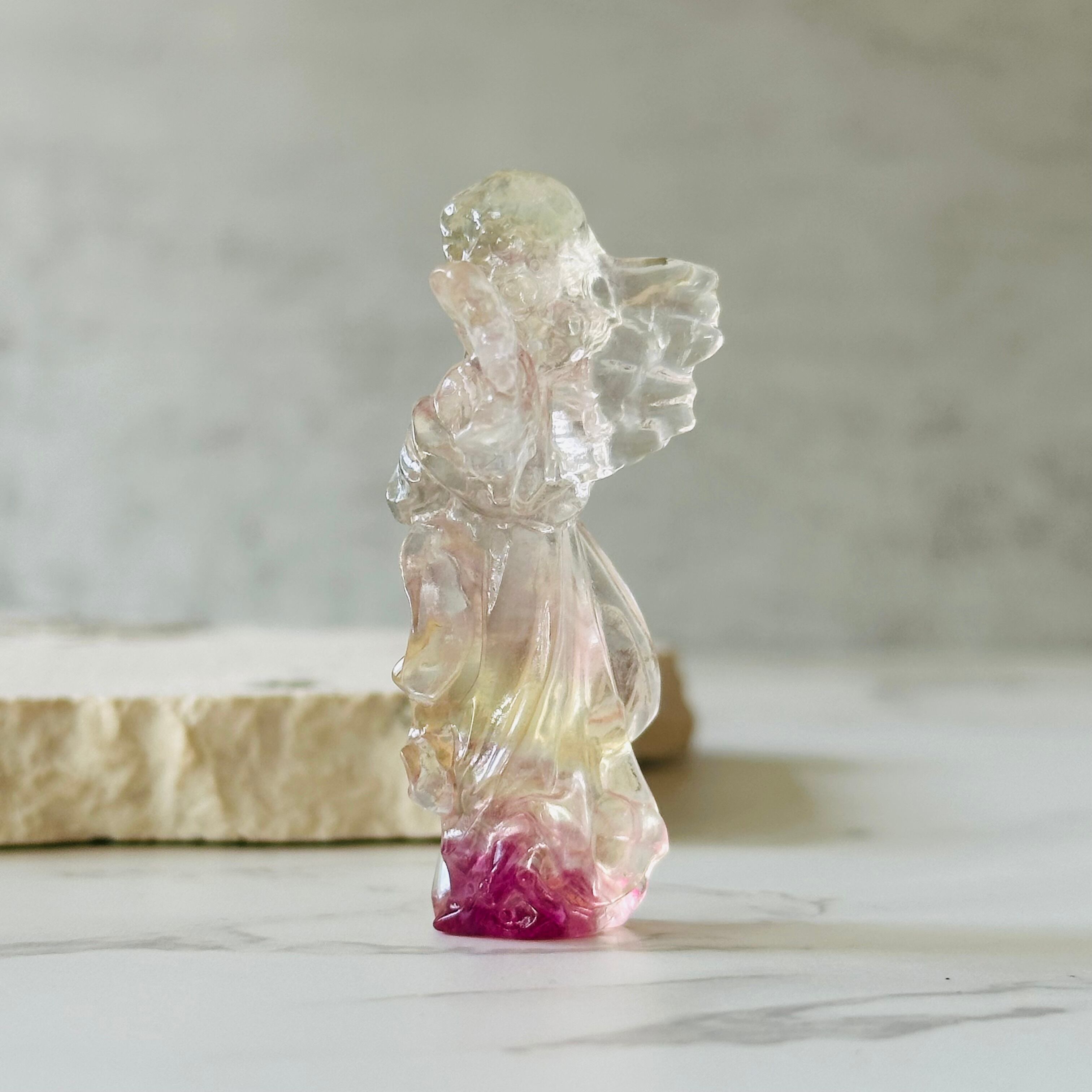 繊細で可憐な印象のフローライトエンジェル。透明感たっぷりのフローライトがとても綺麗です。