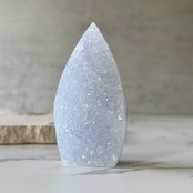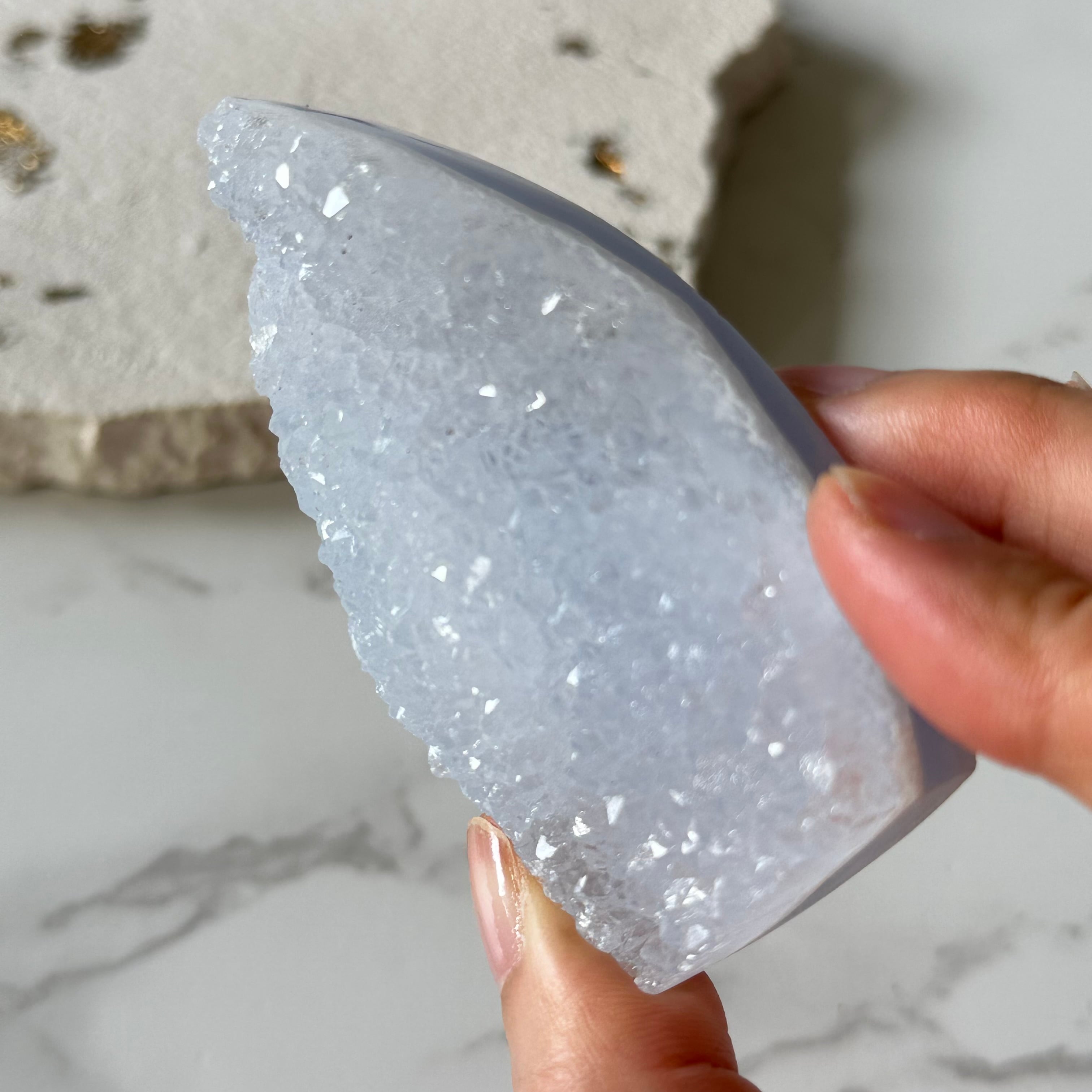 淡いサックスブルーの層とキラキラ白い結晶が上品なブルーレースアゲートのフリーフォームです。降り積もった雪のように繊細で美しいアイテムです。