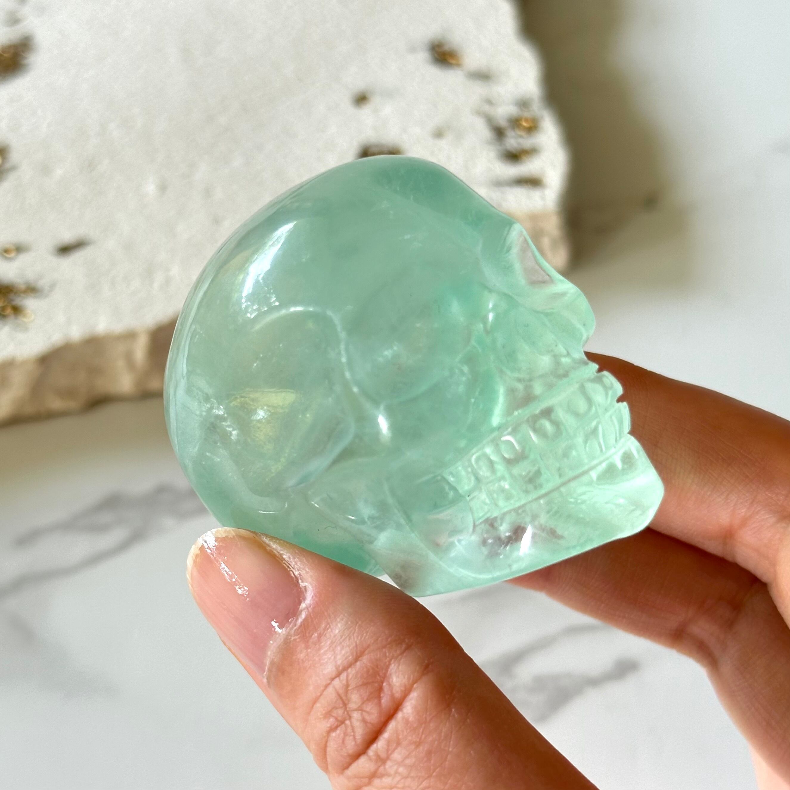 透明度の高いグリーンフローライトのスカルヘッドです。