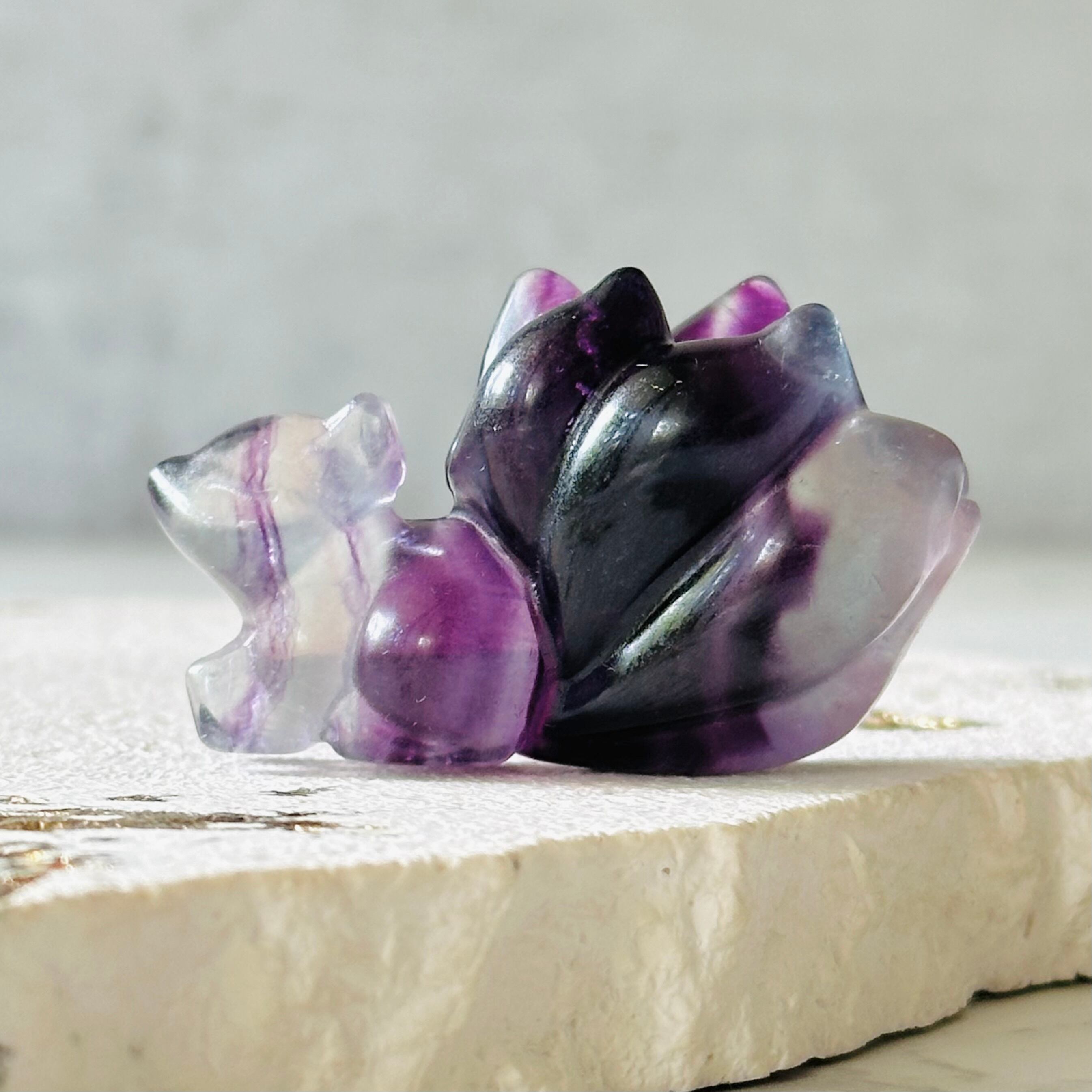 ボディは深いパープルで、お顔としっぱの先端は透明感たっぷりの爽やかなミントグリーンです。キャンディフローライト特有の美しい縞模様が楽しめます。