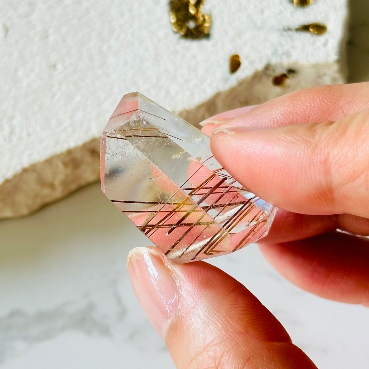 水晶の中に黄金色の針状結晶(ルチル)が閉じ込められたルチルクォーツのフリーフォームです。