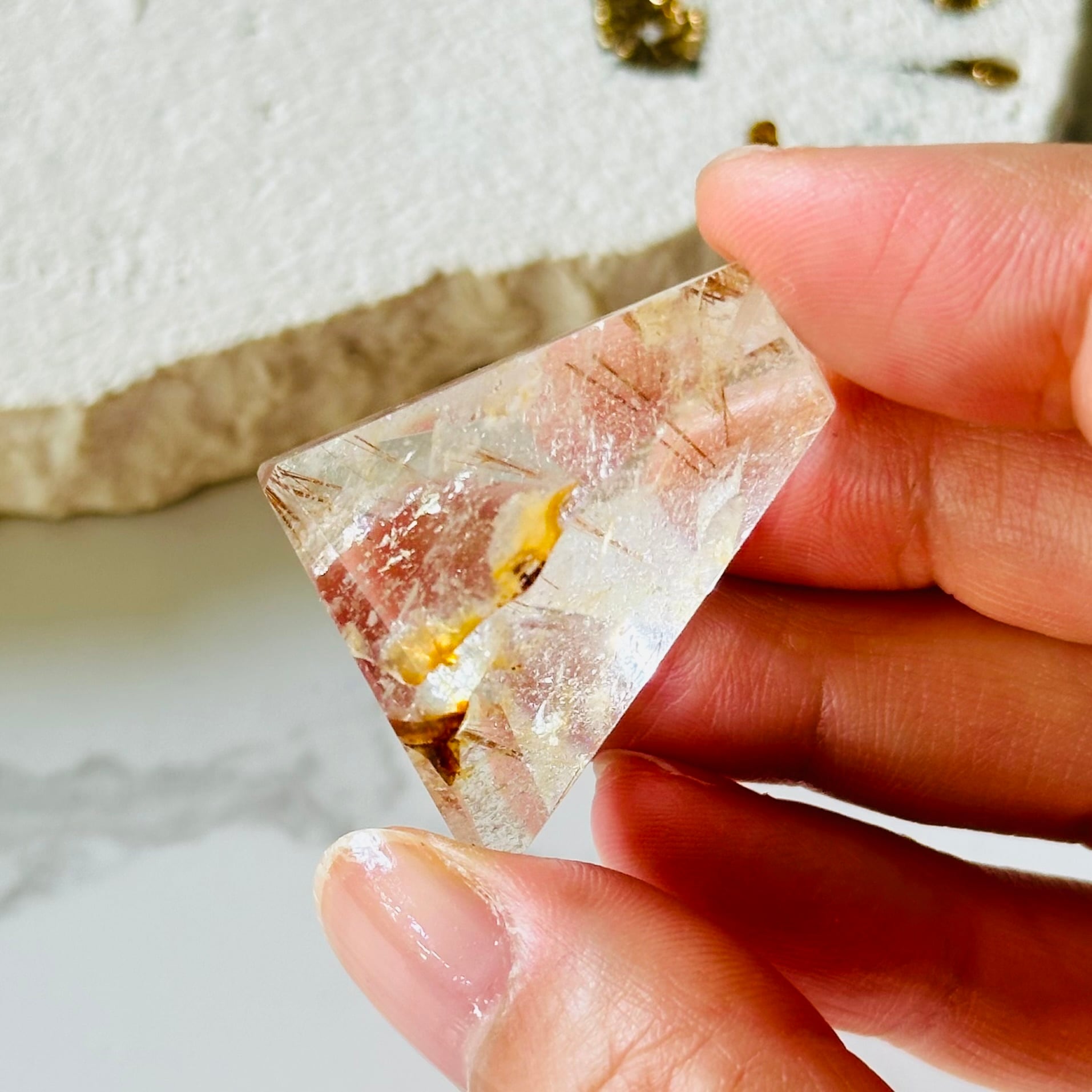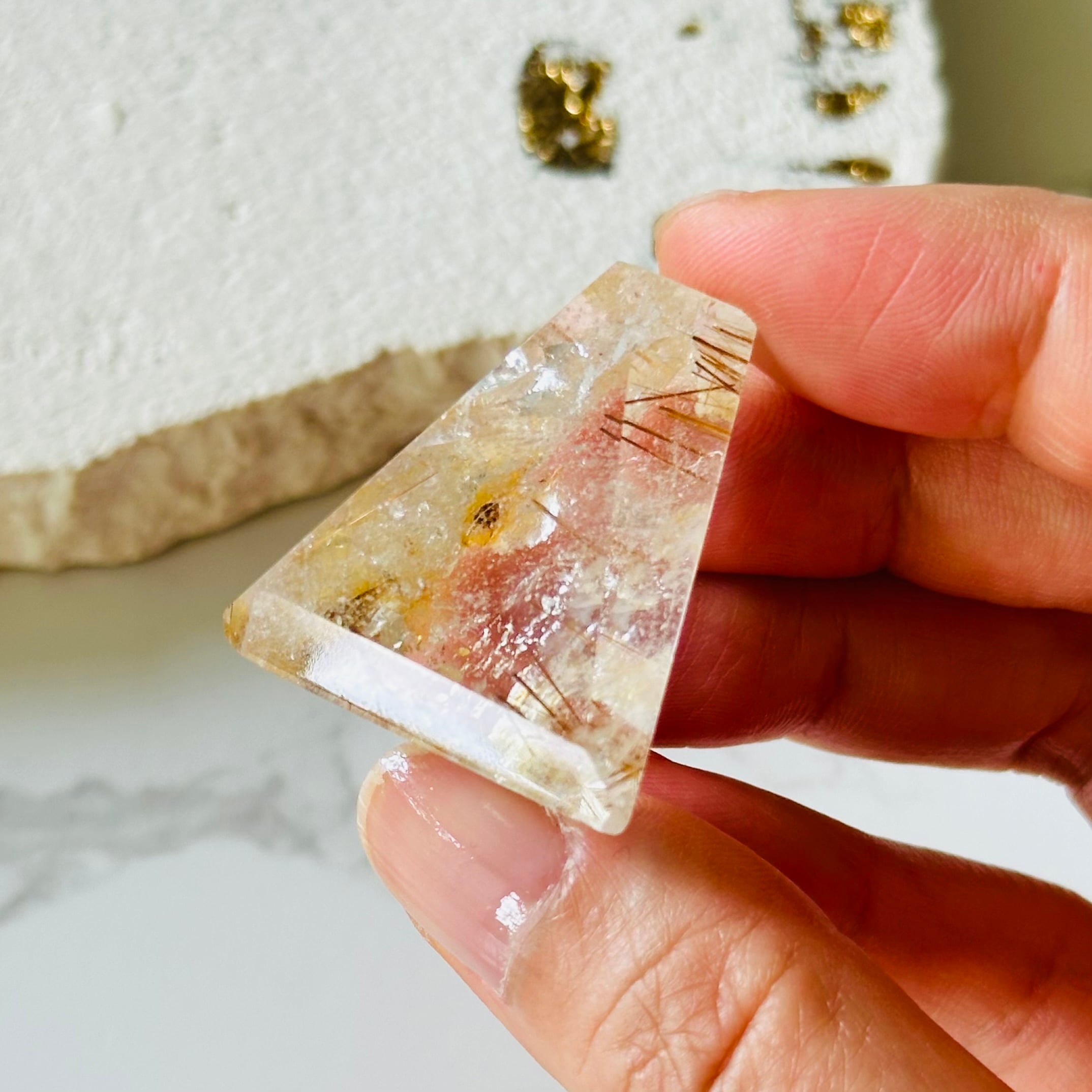 水晶の中に黄金色の針状結晶(ルチル)が閉じ込められたルチルクォーツのフリーフォームです。