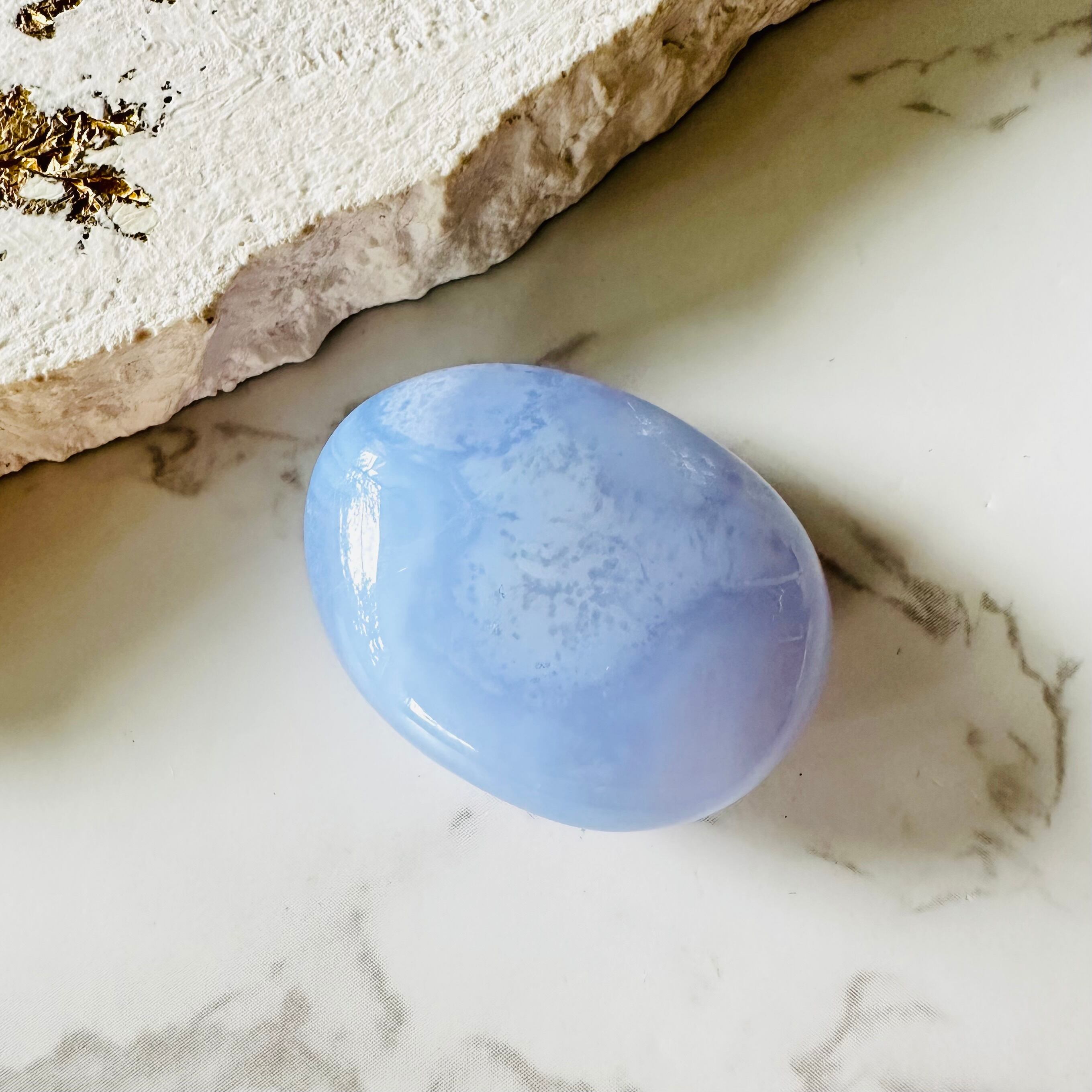 上品なサックスブルーのブルーレースアゲートパームストーンです。