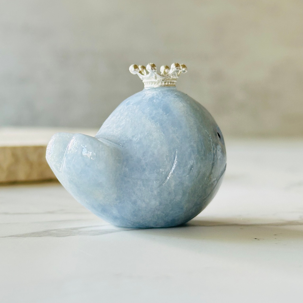 セレスタイトは青い空や澄んだ海を思わせる美しいブルーが特徴です。比較的柔らかい石なので、通常は原石のまま流通しています。このように生き物の形に加工されることは珍しいです。ベッドサイドにぜひ置いてほしいアイテムです。
