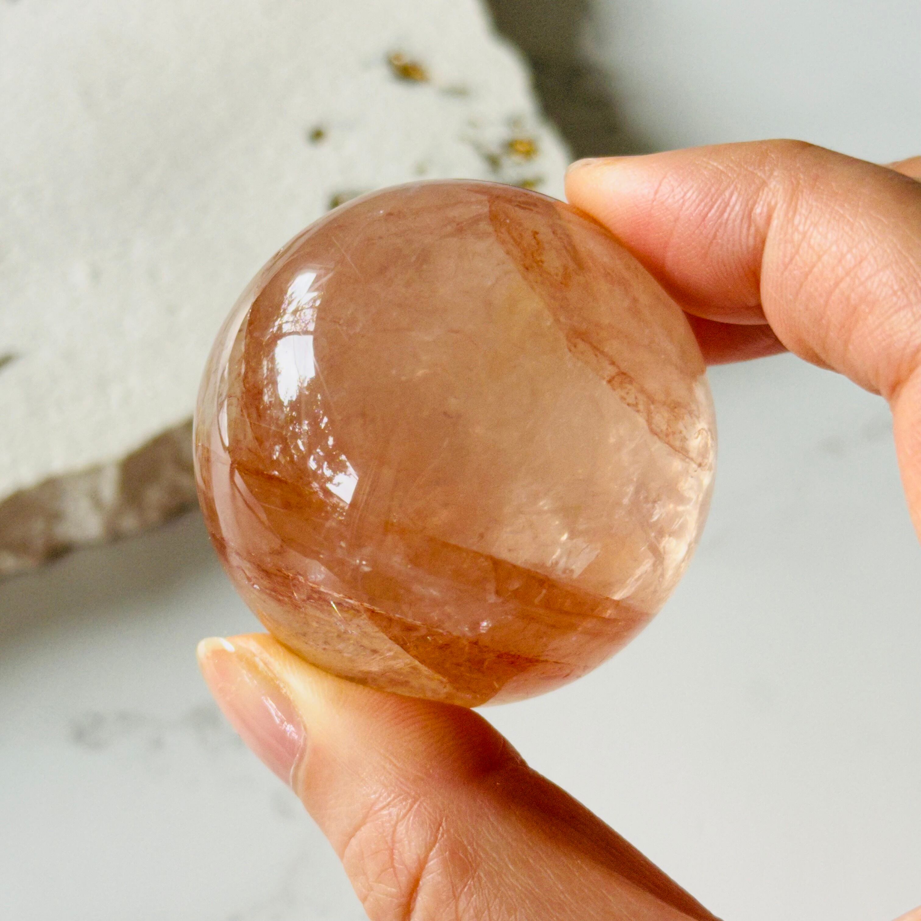 水晶内部で再結晶したリモナイトの成分が、水中に美しく輝く鱗のようで、和名を「金魚水晶」とも言います。金魚鉢のような美しいスフィアは見ていて飽きることがありません。