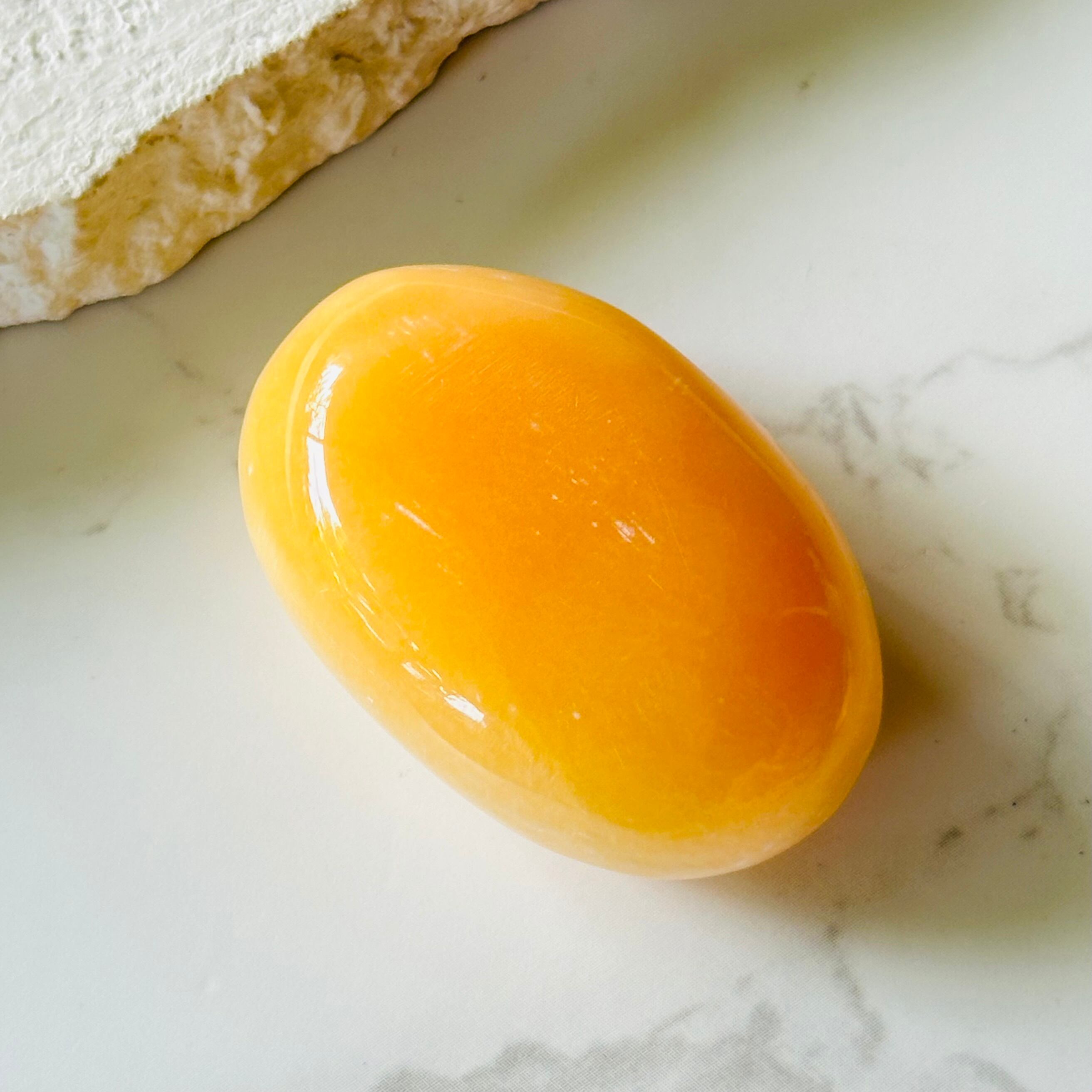 艶やかなオレンジカルサイトのパームストーンです。カルサイトの軽やかな質感と、美しい発色が魅力です。