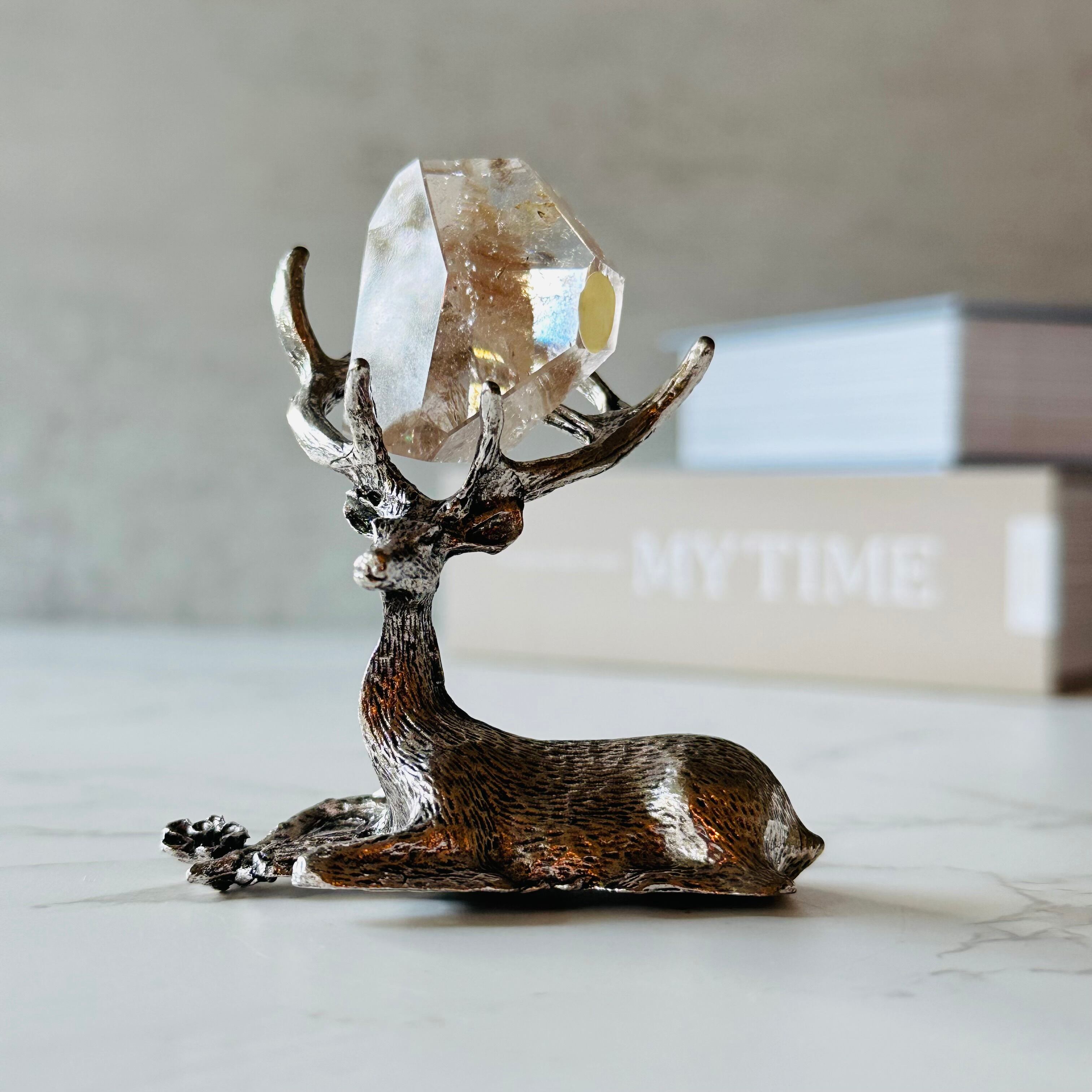 白く重なり合う美しい層と虹を持つガーデンクォーツのフリーフォームをアンティーク調で繊細なデザインの鹿の台座とセットにしました。大変お得なセット価格にてご提供します。