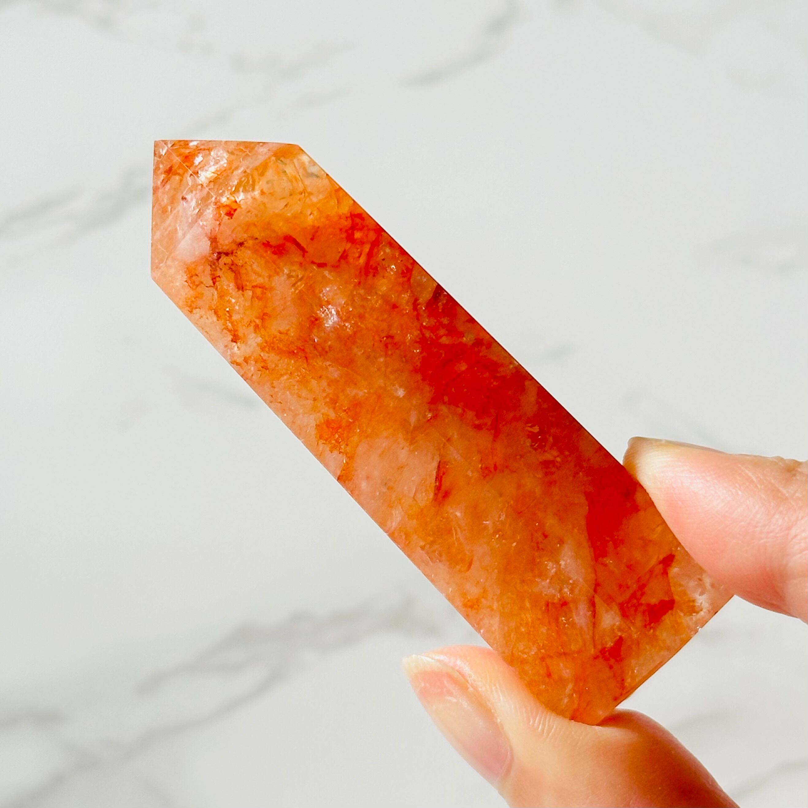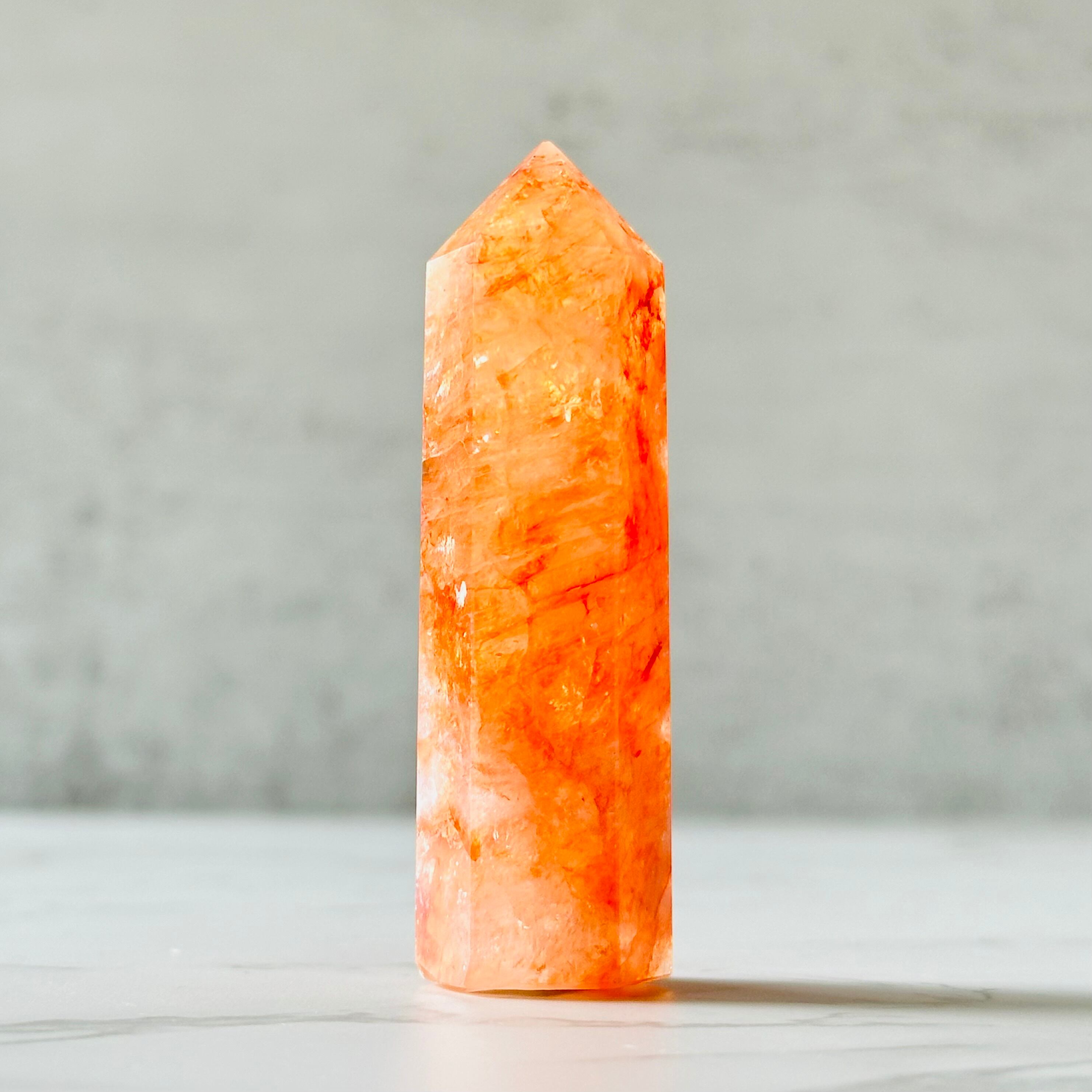 明るいオレンジ色が暖かなエネルギーを与えてくれるファイヤークォーツです。透明感のある美しいオレンジのタワーの至る所にキラキラとした虹やシルバーの輝きが見られます。