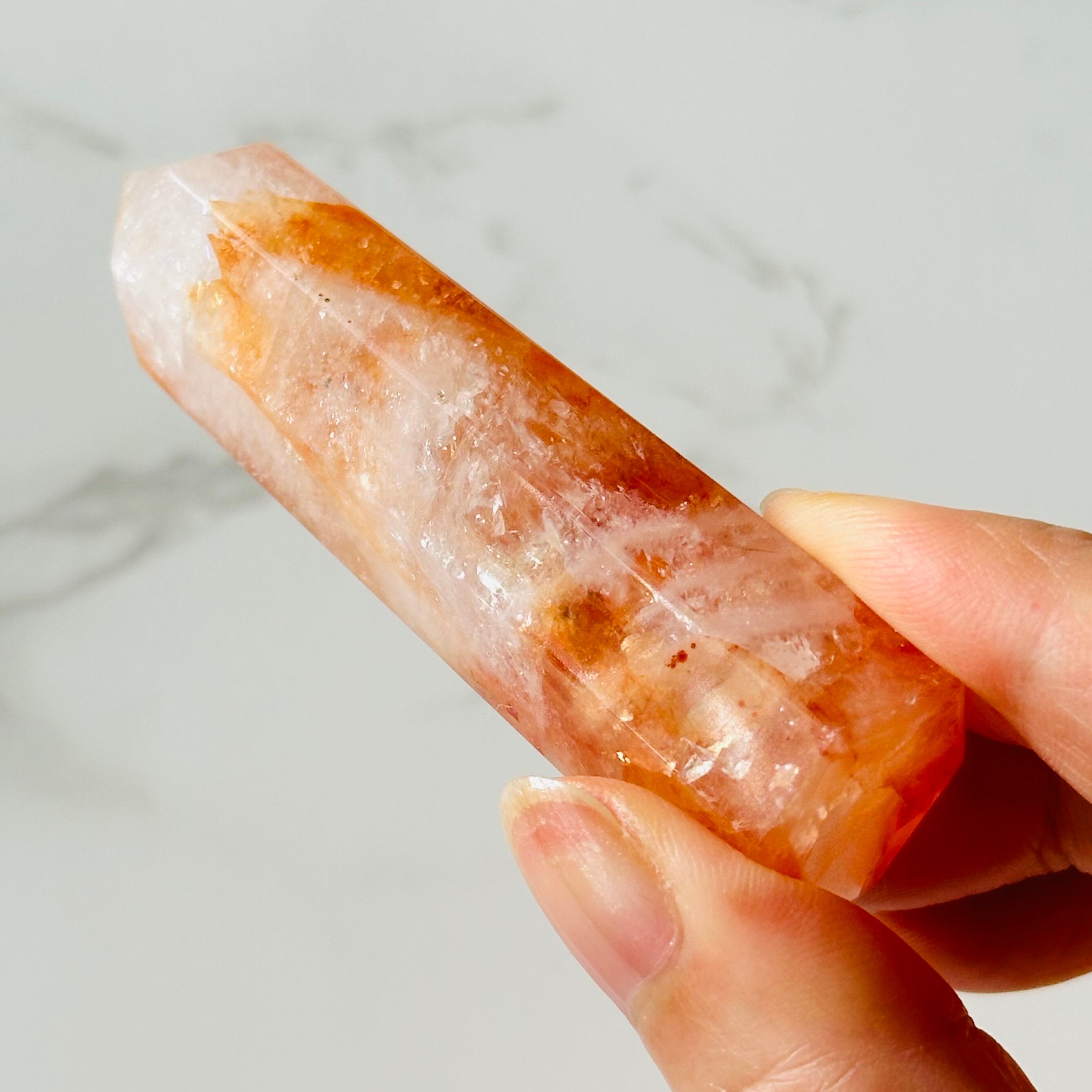 明るいオレンジ色が暖かなエネルギーを与えてくれるファイヤークォーツです。透明感のある美しいオレンジのタワーの至る所にキラキラとした虹やシルバーの輝きが見られます。
