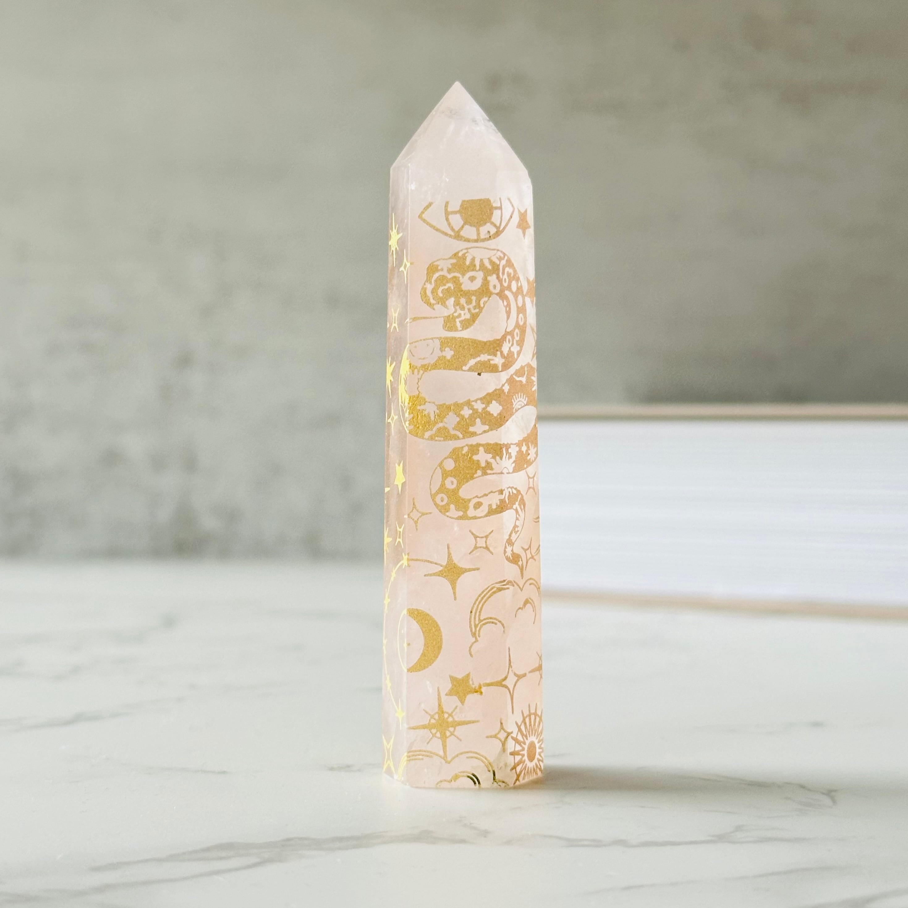 ローズクォーツにスピリチュアルシンボルを刻んだタワーです。