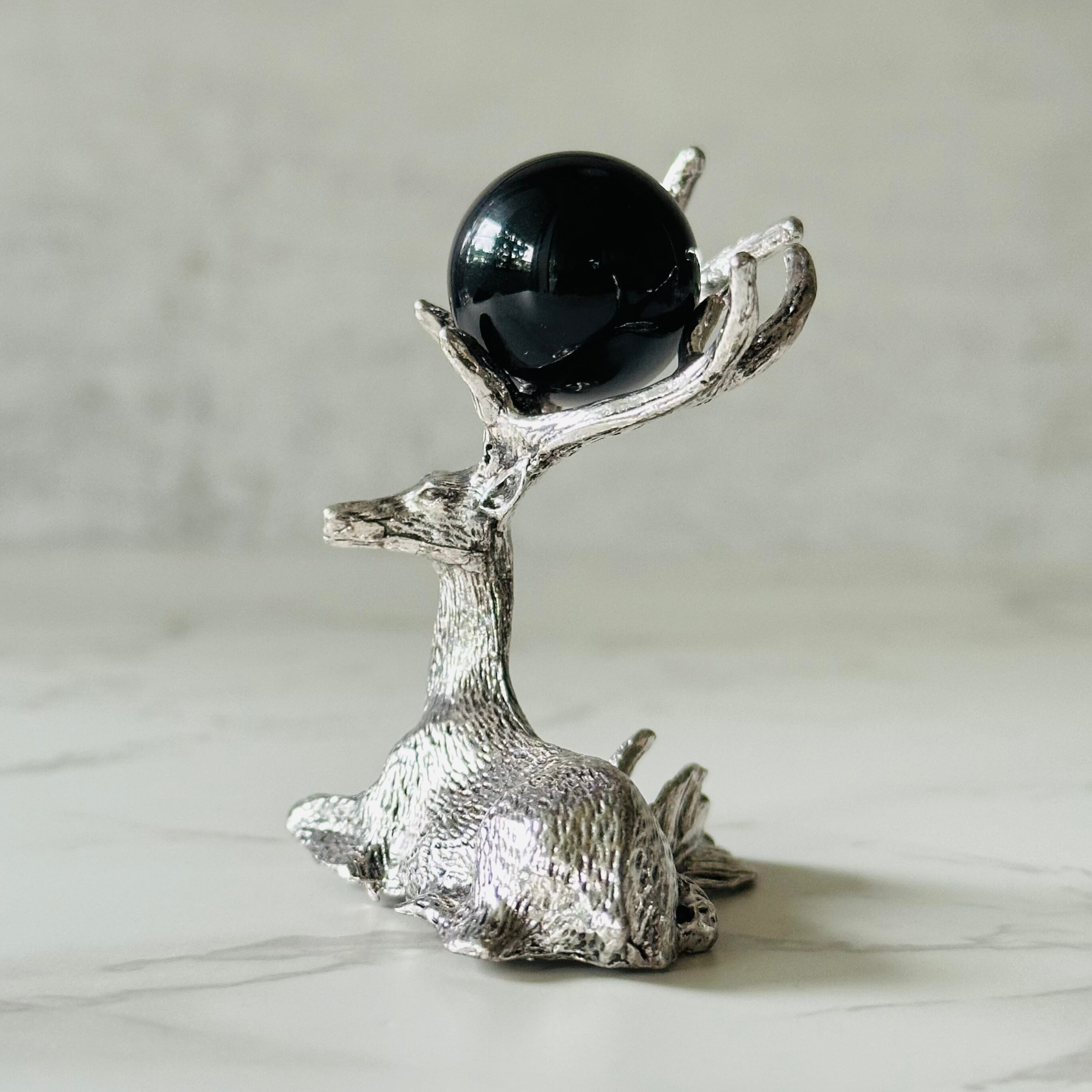 艶めく漆黒が美しいモリオンスフィアと繊細なデザインの鹿の台座のセットです。