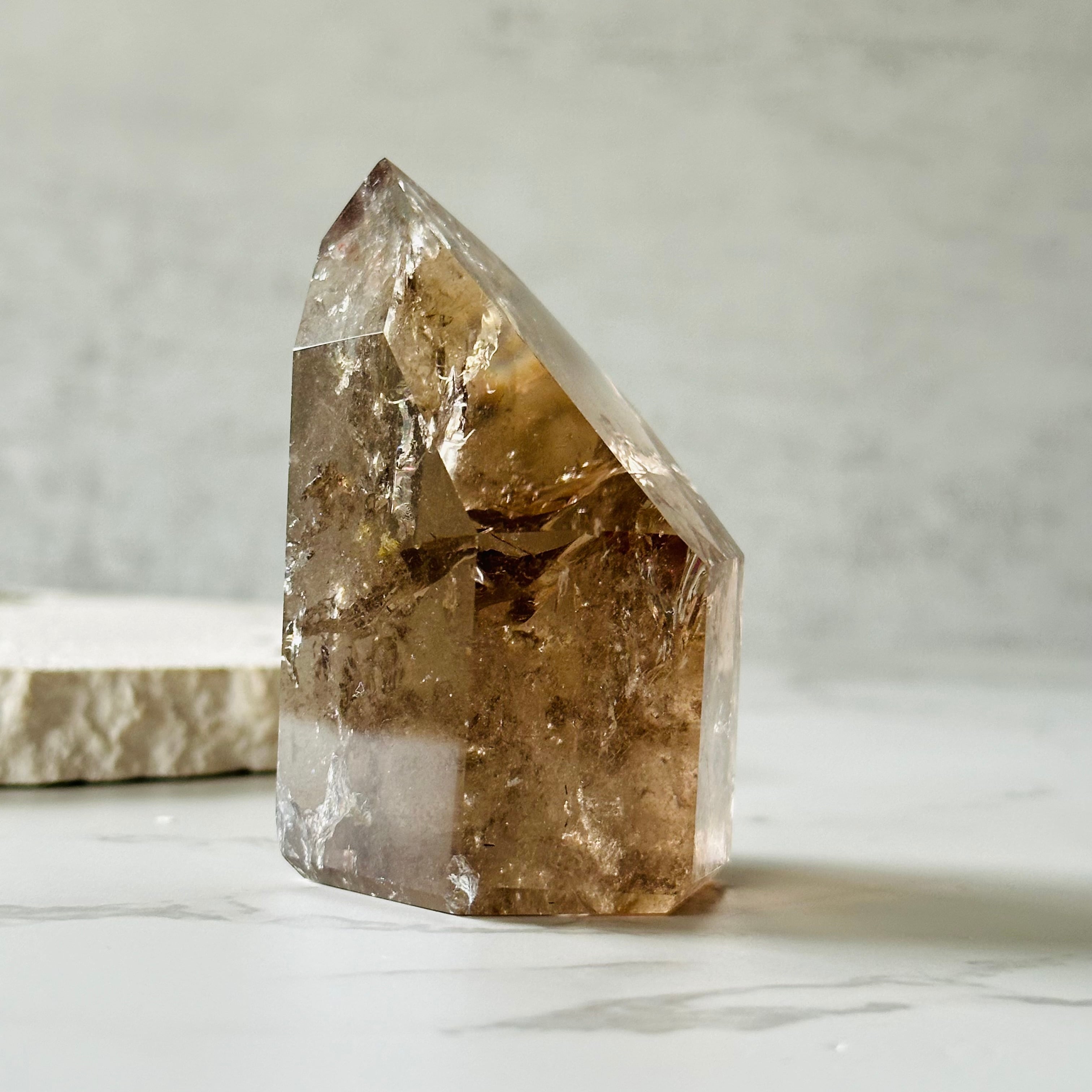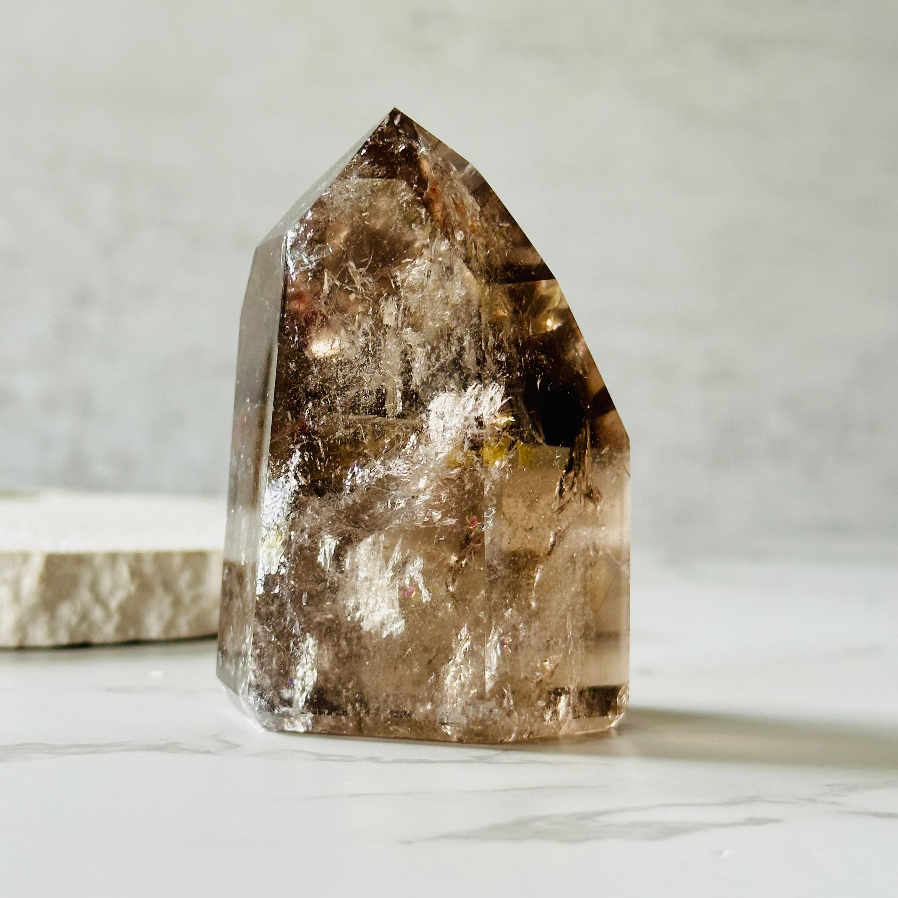 落ち着いたブラウンの色味で、内部には無数のクラックが生み出す繊細かつ複雑な光の屈折と虹の共演が見られます。先端は一般的なポイントのシャープなカットと違い柔らかなデザインで、ニュアンスのある色合いと相まって優しく穏やかな雰囲気を作り出しています。時間を忘れてひきこまれてしまう美しいタワーです。