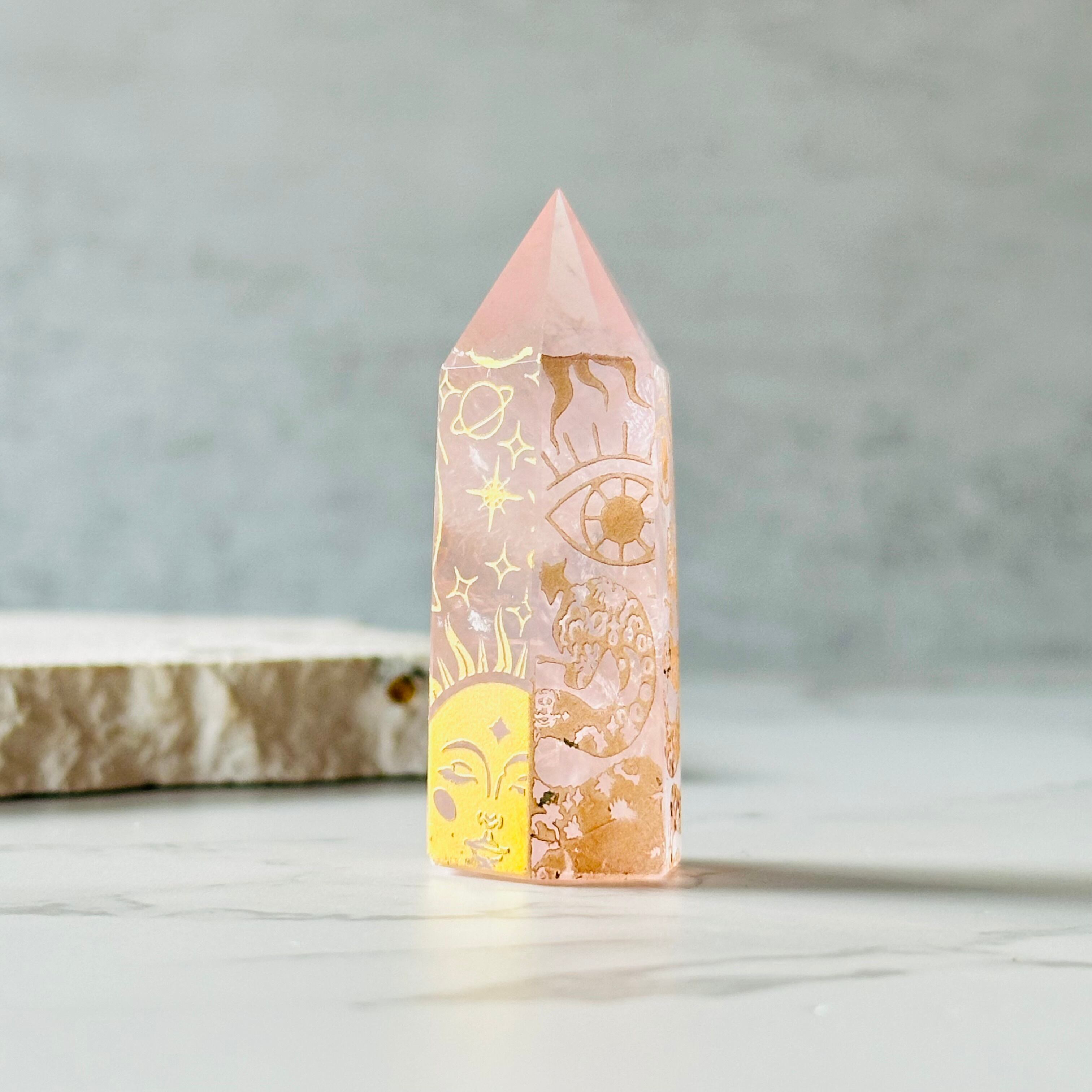 ローズクォーツにスピリチュアルシンボルを刻んだタワーです。