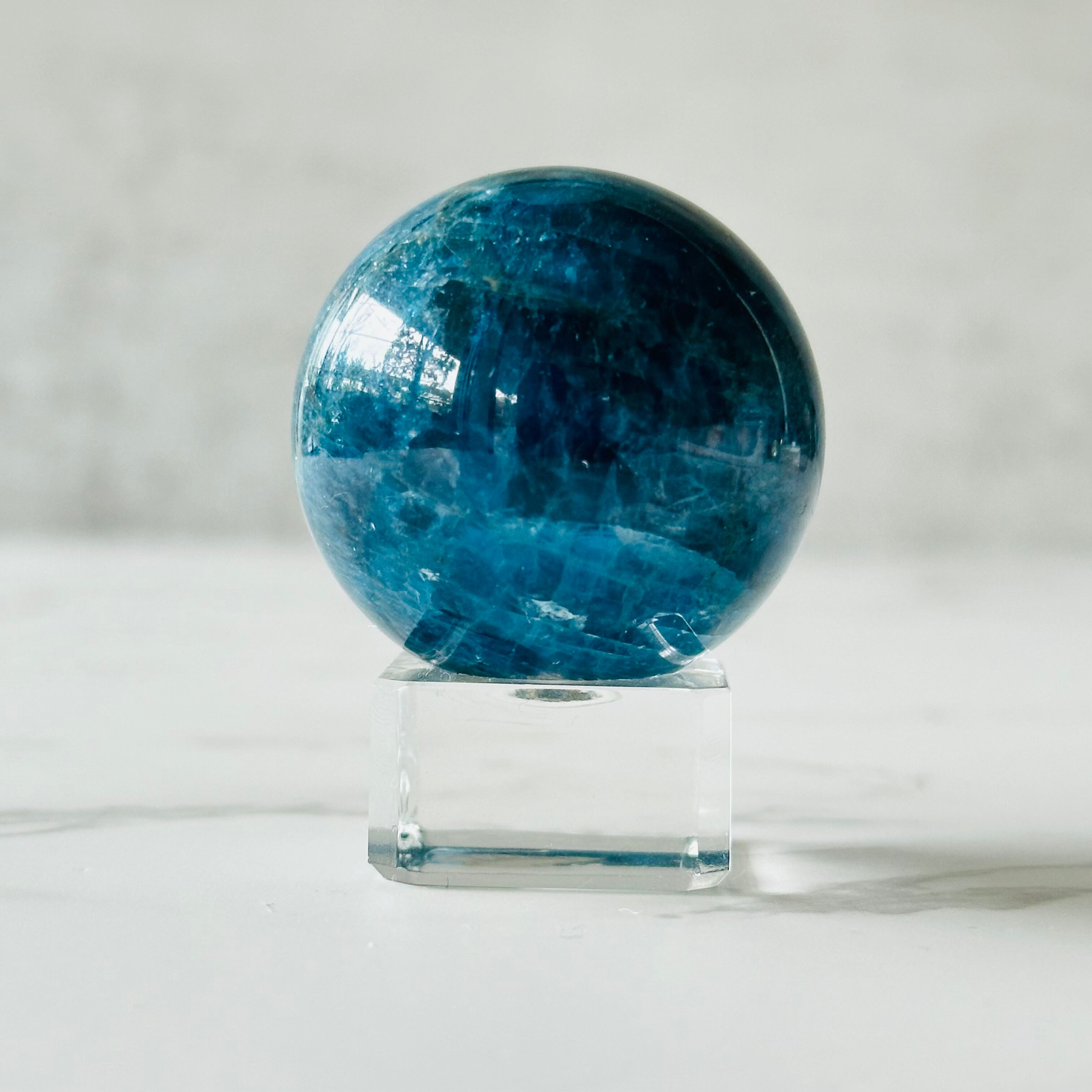 美しいブルーの色合いは海や空、地球を連想させます。このスフィアを手に取ると、自分自身が地球の一部であると感じられるような気がします。シラーの煌めきはシルクの光沢のように上品に輝きます。いつまでも見飽きることなく時間を忘れてしまうアイテムです。