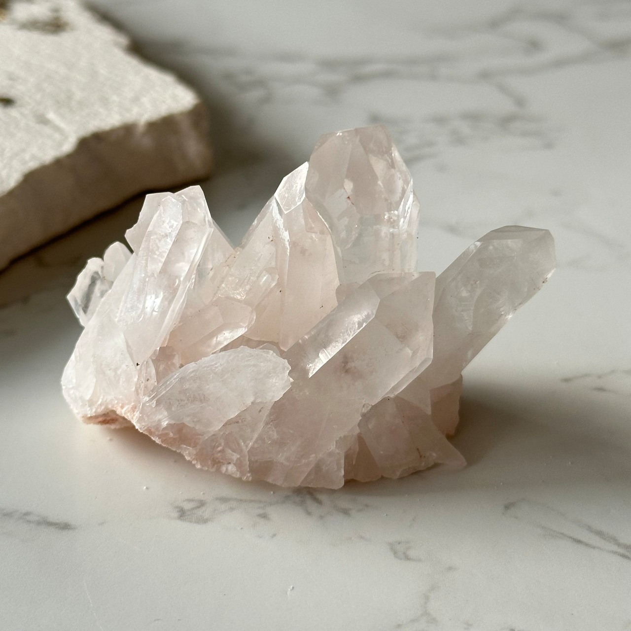 ほんのりピンクに色づいた可愛らしいクラスターです。メインとなる結晶には象徴的なウィンドウウが見られます。ウィンドウは水晶の錐面と柱面の間に見られるひし形(ダイヤ形)のことで、潜在意識や異なる次元の世界と繋がる窓だとされています。
