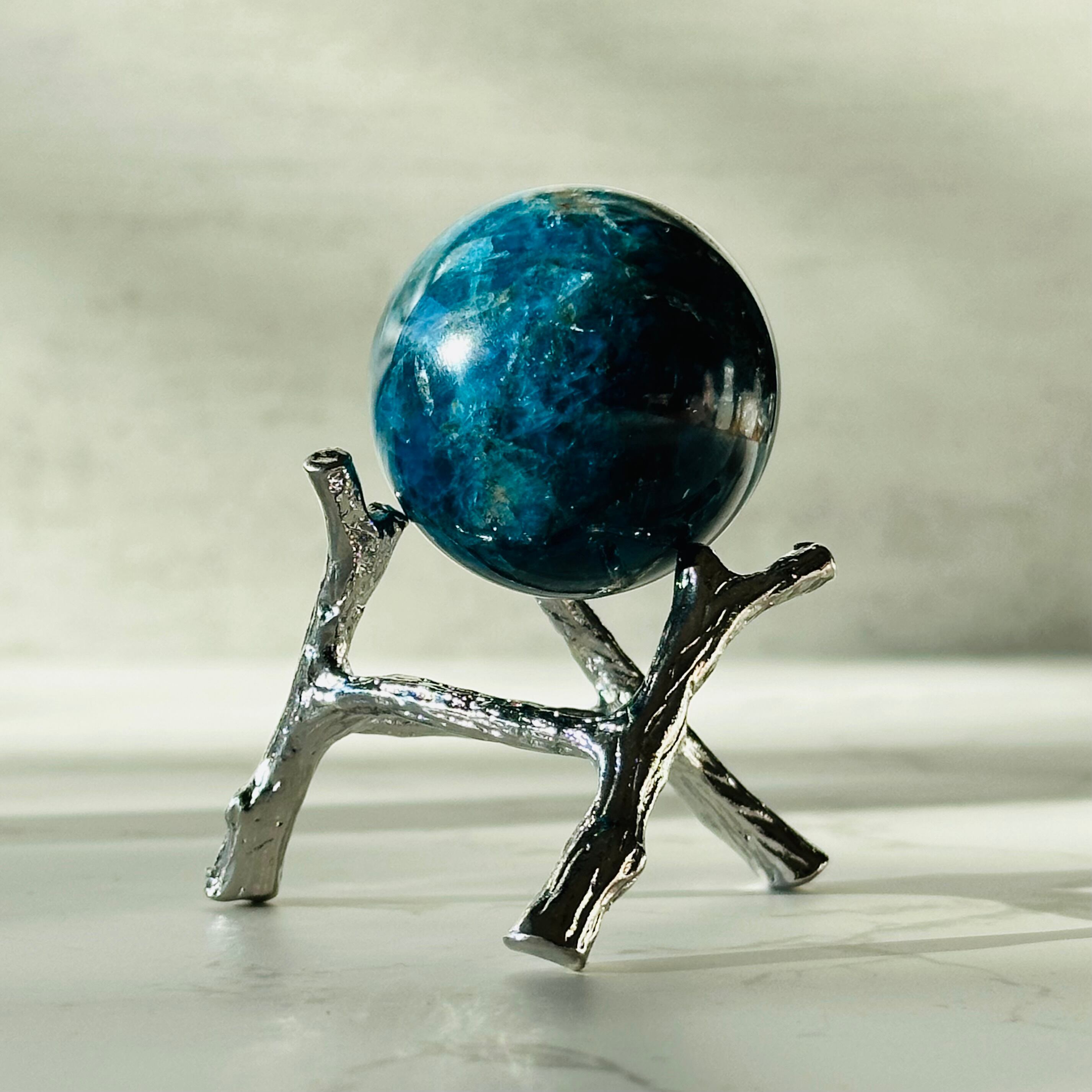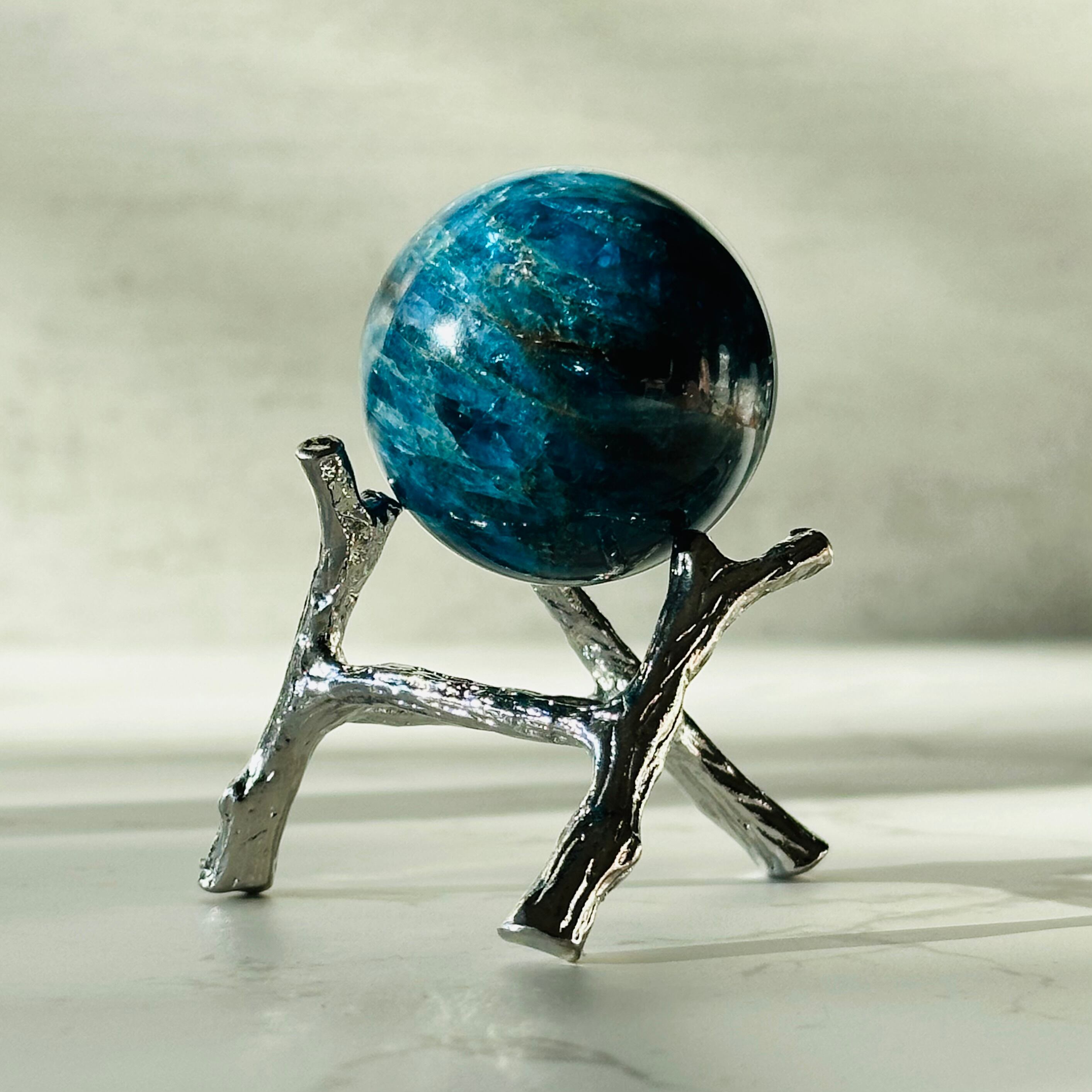 美しいブルーの色合いは海や空、地球を連想させます。このスフィアを手に取ると、自分自身が地球の一部であると感じられるような気がします。シラーの煌めきはシルクの光沢のように上品に輝きます。いつまでも見飽きることなく時間を忘れてしまうアイテムです。