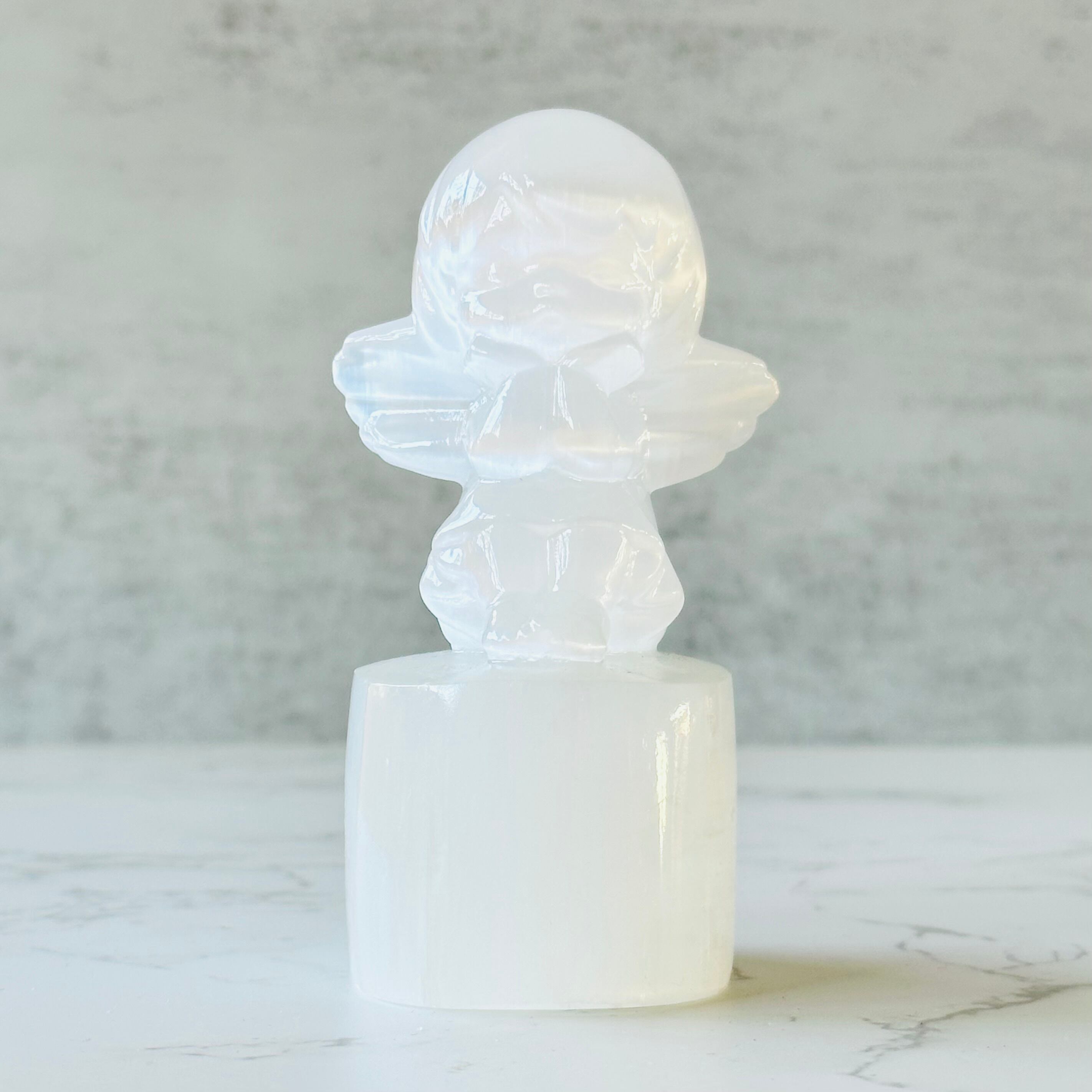 キャッツアイ効果が綺麗なセレナイトで、あどけない表情と仕草がとても可愛らしい少女を削り出しました。背中には天使の羽を持ちます。セレナイトは柔らかいお石で繊細な加工を施すのは難しいとされてきましたが、加工技術の進歩によりこのようなカーヴィングが可能になりました。