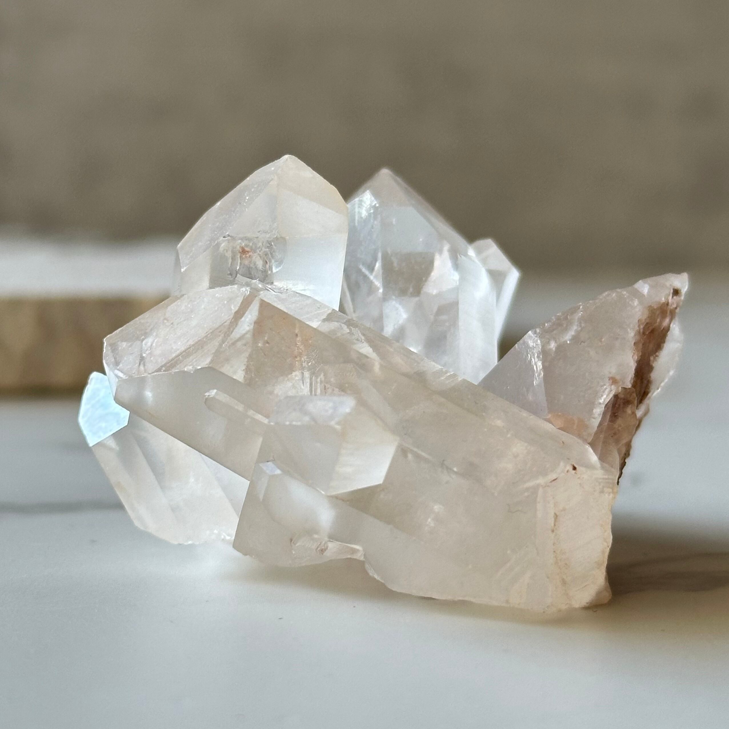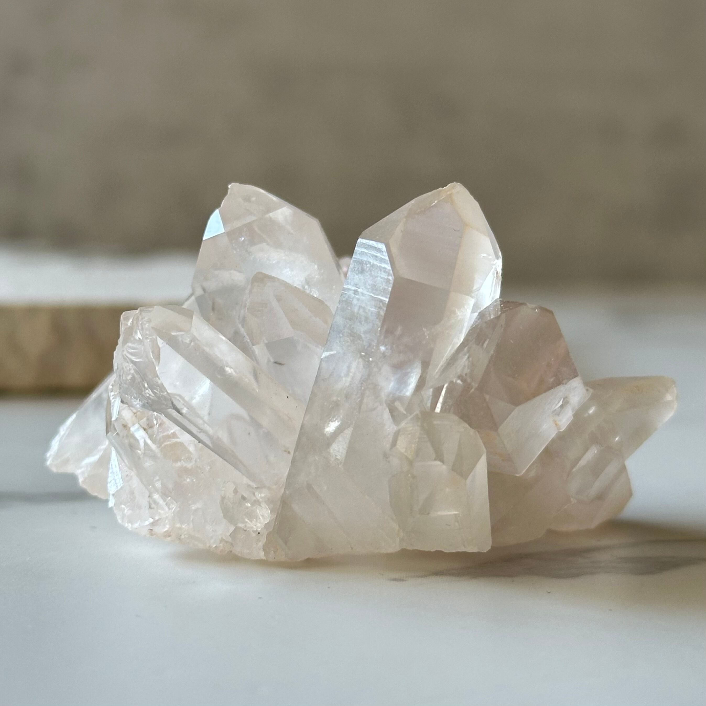 ほんのりピンクに色づいた可愛らしいクラスターです。結晶にはクラックや内包物が少なくクリアでバランスの良い形をしています。女性らしい柔らかな雰囲気が魅力です。