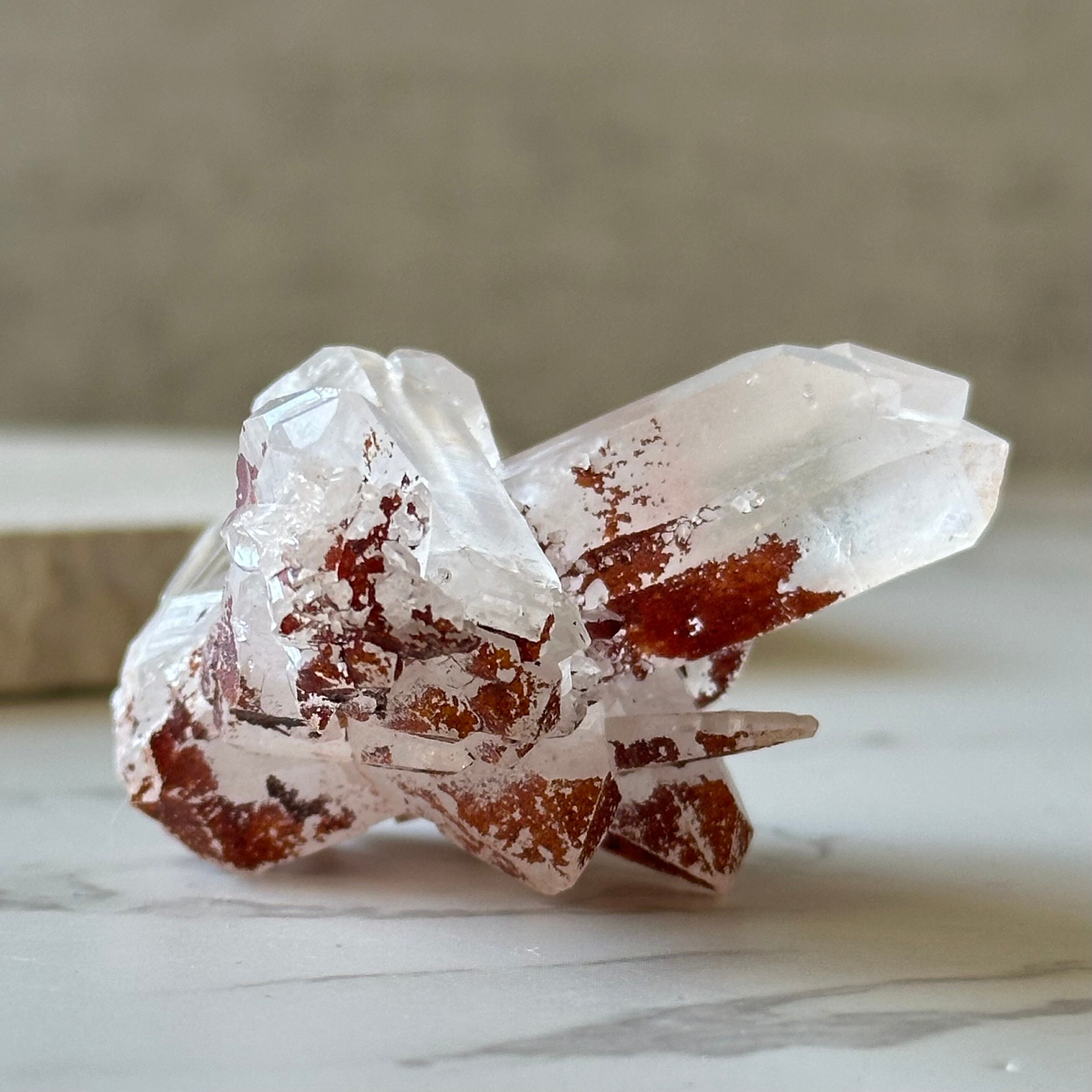 結晶がほんのりピンクに色づいた可愛らしいクラスターです。育った土壌の雰囲気を残す赤い成分が付着しているところが最大の魅力です。自然の素朴さを残しながらも女性らしい柔らかな雰囲気です。