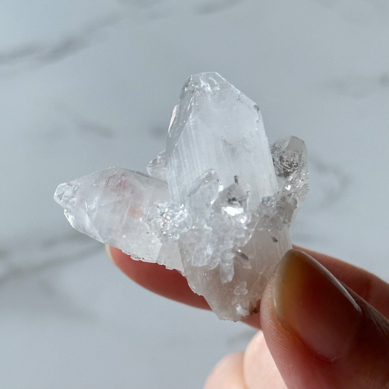 お花のような形と、根元にほんのりピンク色が入ってとても可愛らしいクラスターです。小さなキラキラしたダイヤモンドを寄せ集めたような清らかで強い光を放ちます。角度によってさまざまな表情をみせてくれます。
