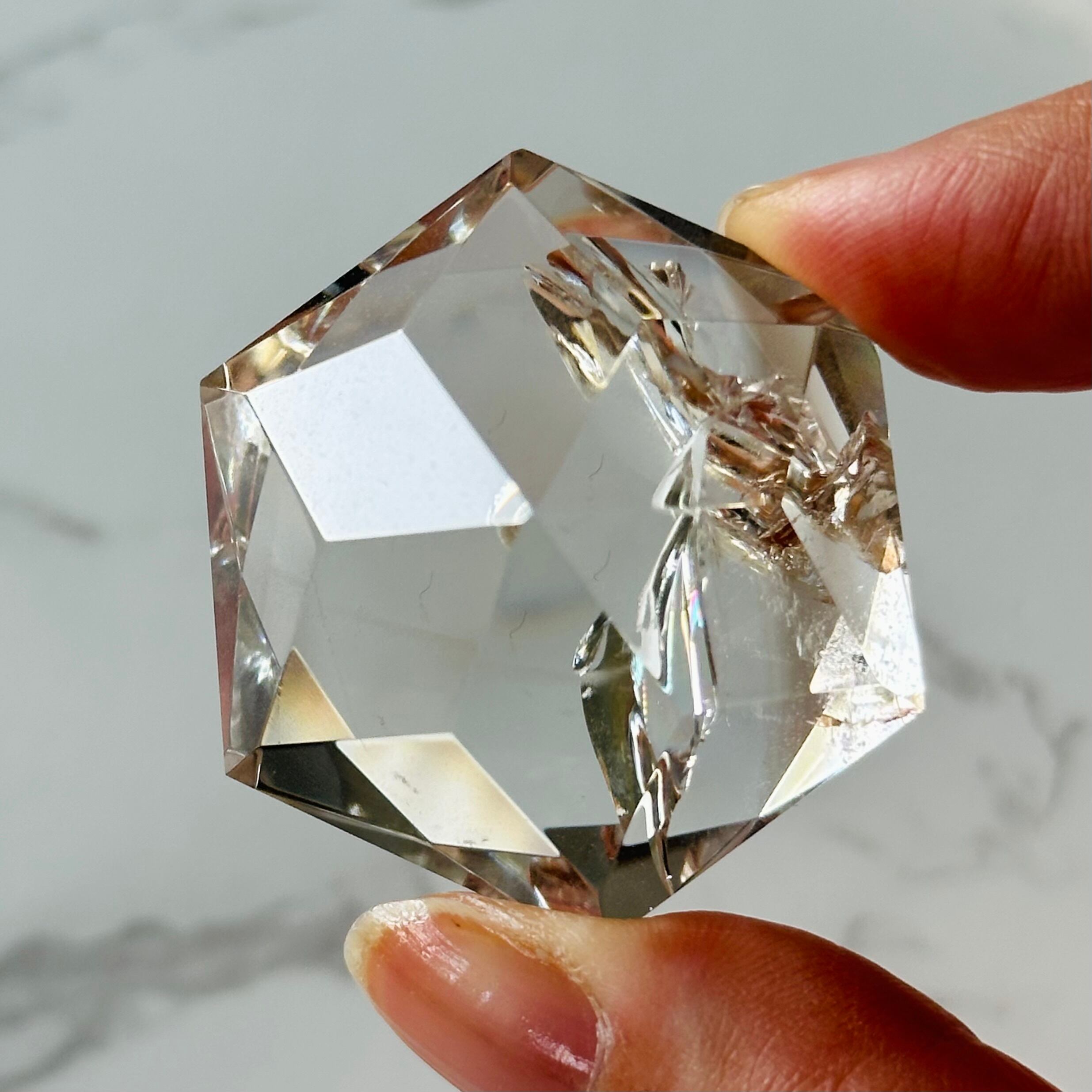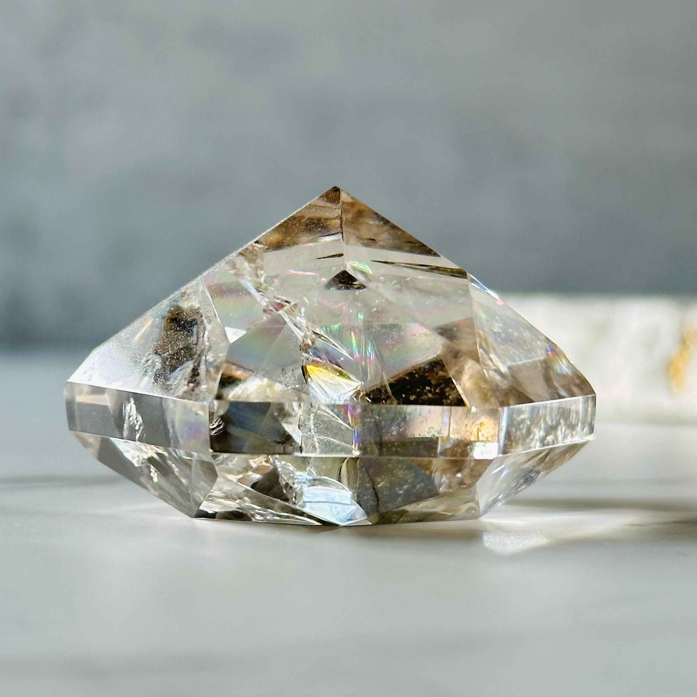 ブラジル水晶のダイヤカットです。ごくわずかにスモーキーがかったお色味で、クリアで美しい水晶と内部のクラックが光を受けて大きな虹を映し出します。