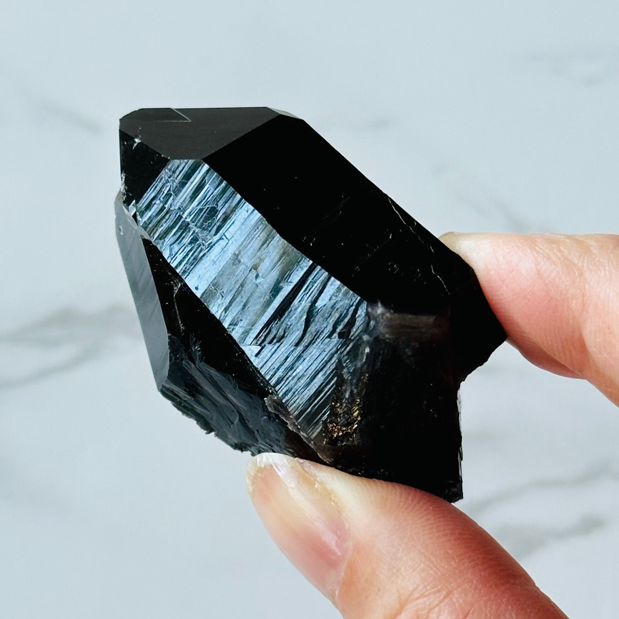 ブラジルミナスジェライス州アーグァス・フォルモーザス産のモリオン原石です。深い漆黒が美しく艶テリの素晴らしい高品質の逸品です。形状はツインでタビューラー、タイムリンクもあるマスタークリスタルで、足元にはマイカの共生が見られます。