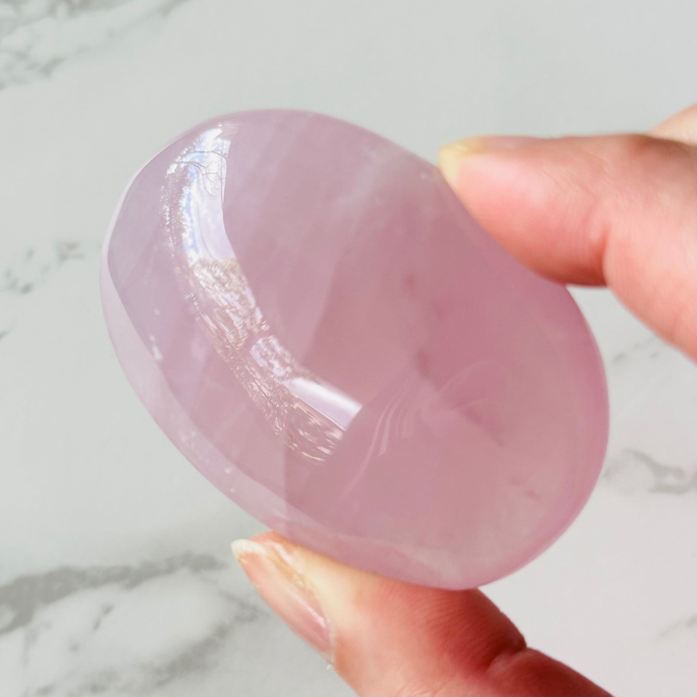 マダガスカル産スターローズクォーツのパームストーンです。ぷるんとしたみずみずしい質感の、とても綺麗なマダガスカル産ローズクォーツ。手のひらに載せて優しく握りしめて波動を感じてください。女性の美を輝かせるローズクオーツは、美活のお守りにぴったりです。お気に入りのアロマオイルを手に馴染ませて軽く握り、枕元に置けば心地よい眠りが訪れてくれそうです。