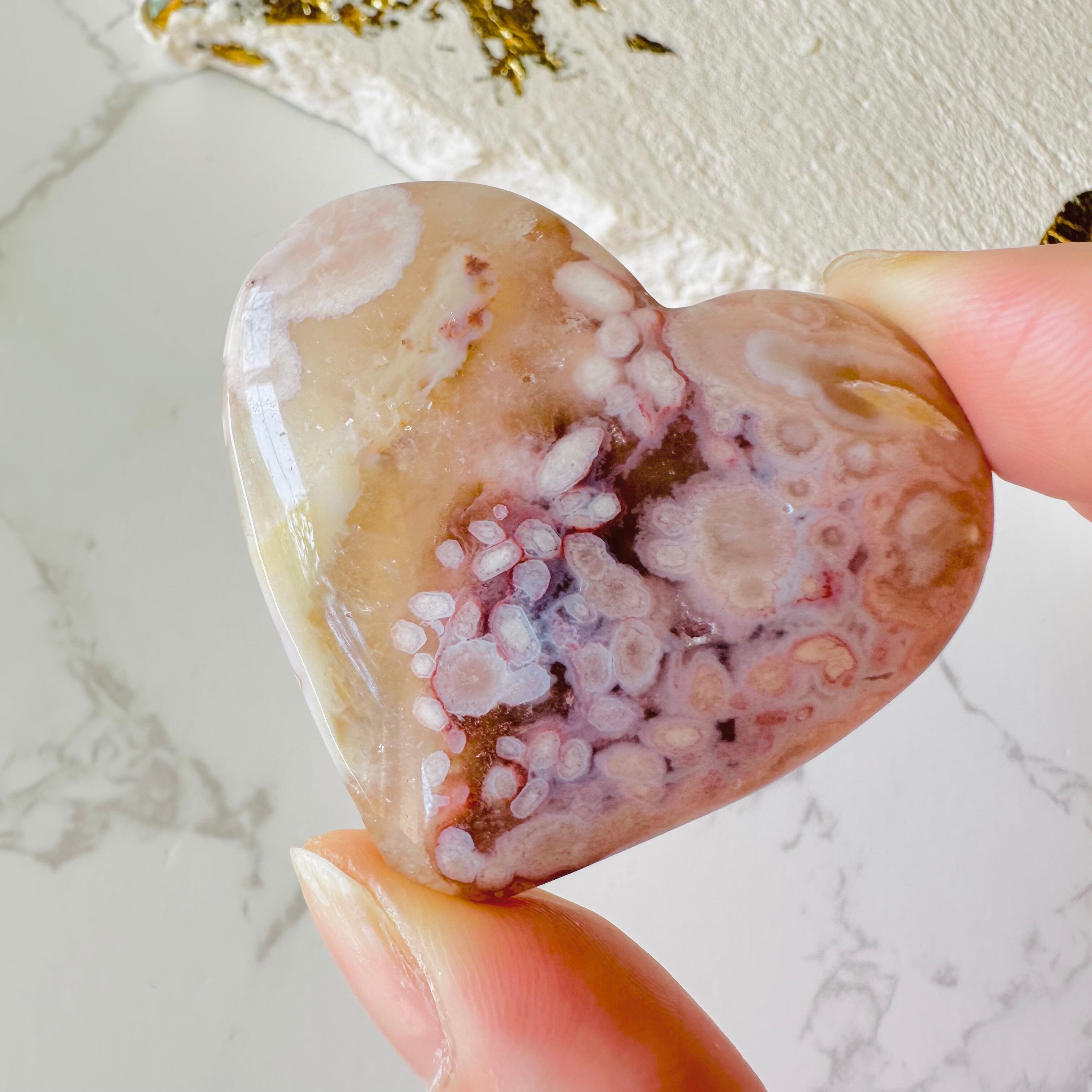 フラワーアゲートとピンクアメジストが共生したしたハート型ストーンです。
