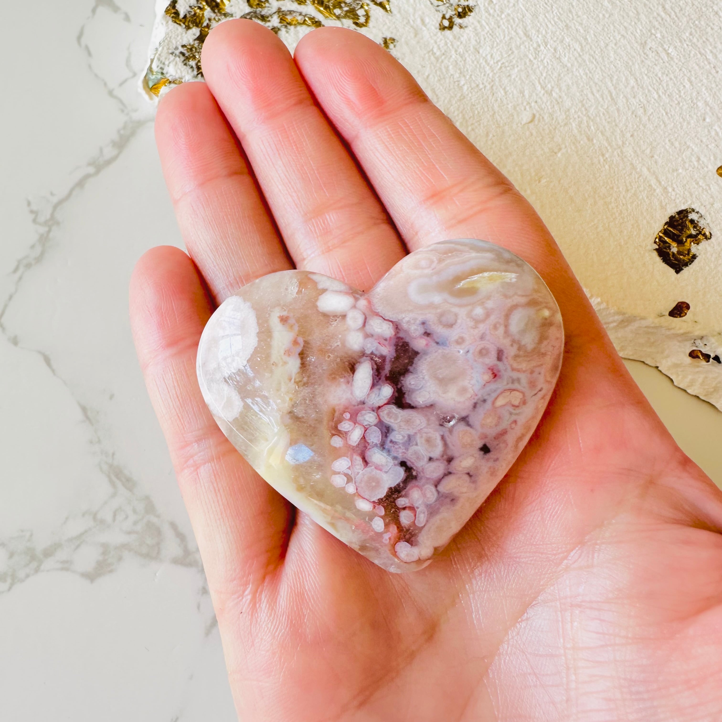フラワーアゲート&ピンクアメジスト共生ハート型ストーン