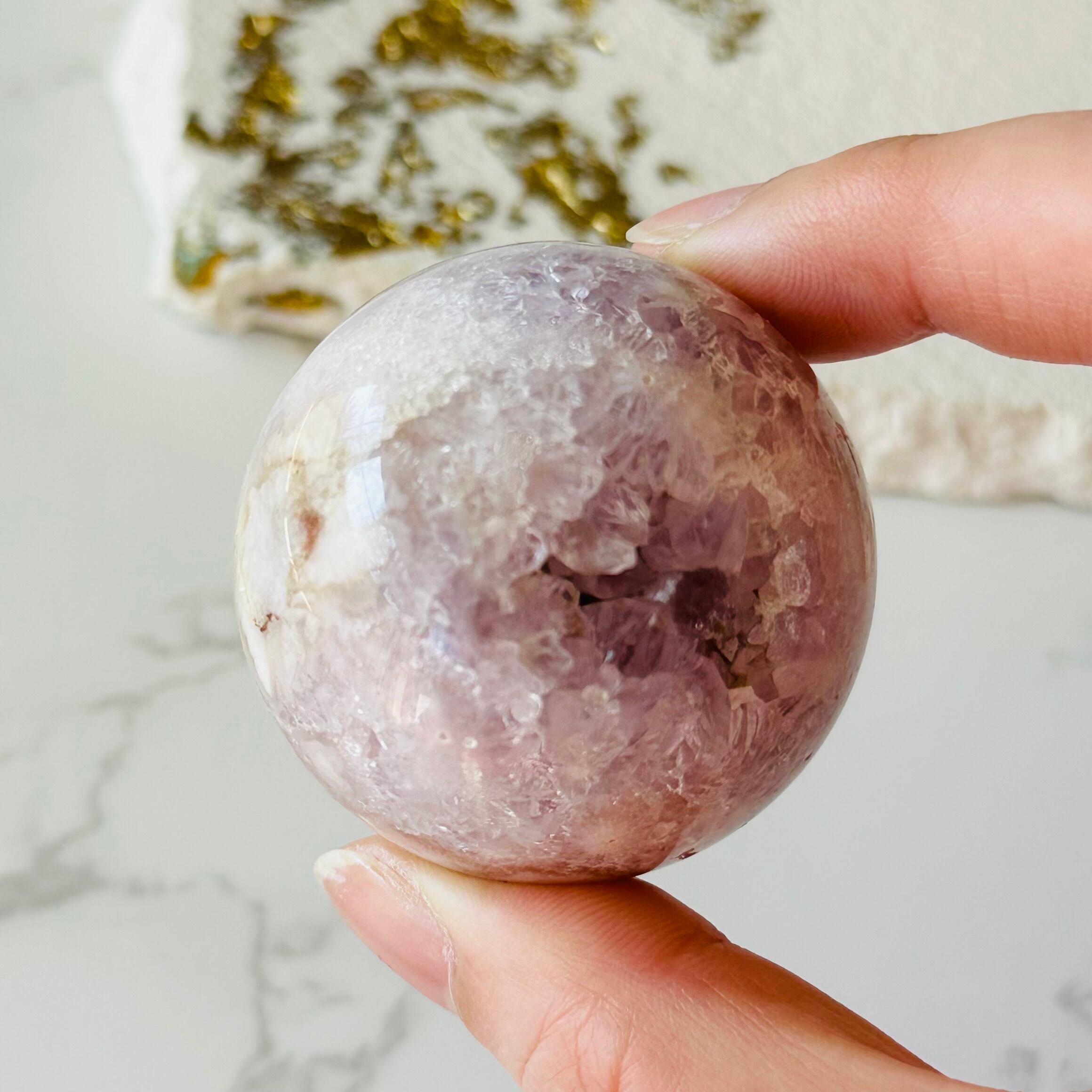 フラワーアゲートとピンクアメジストが共生したしたスフィアです。