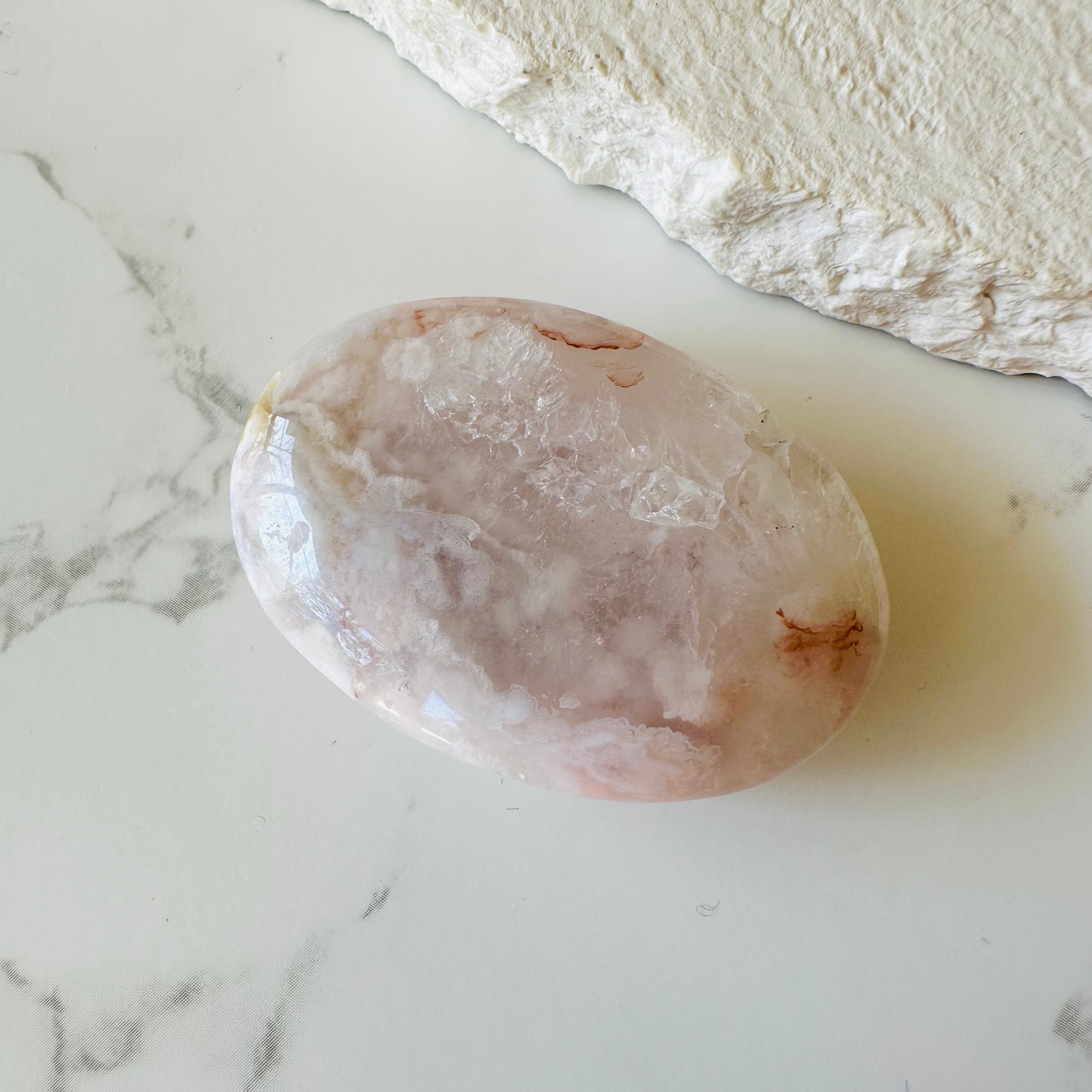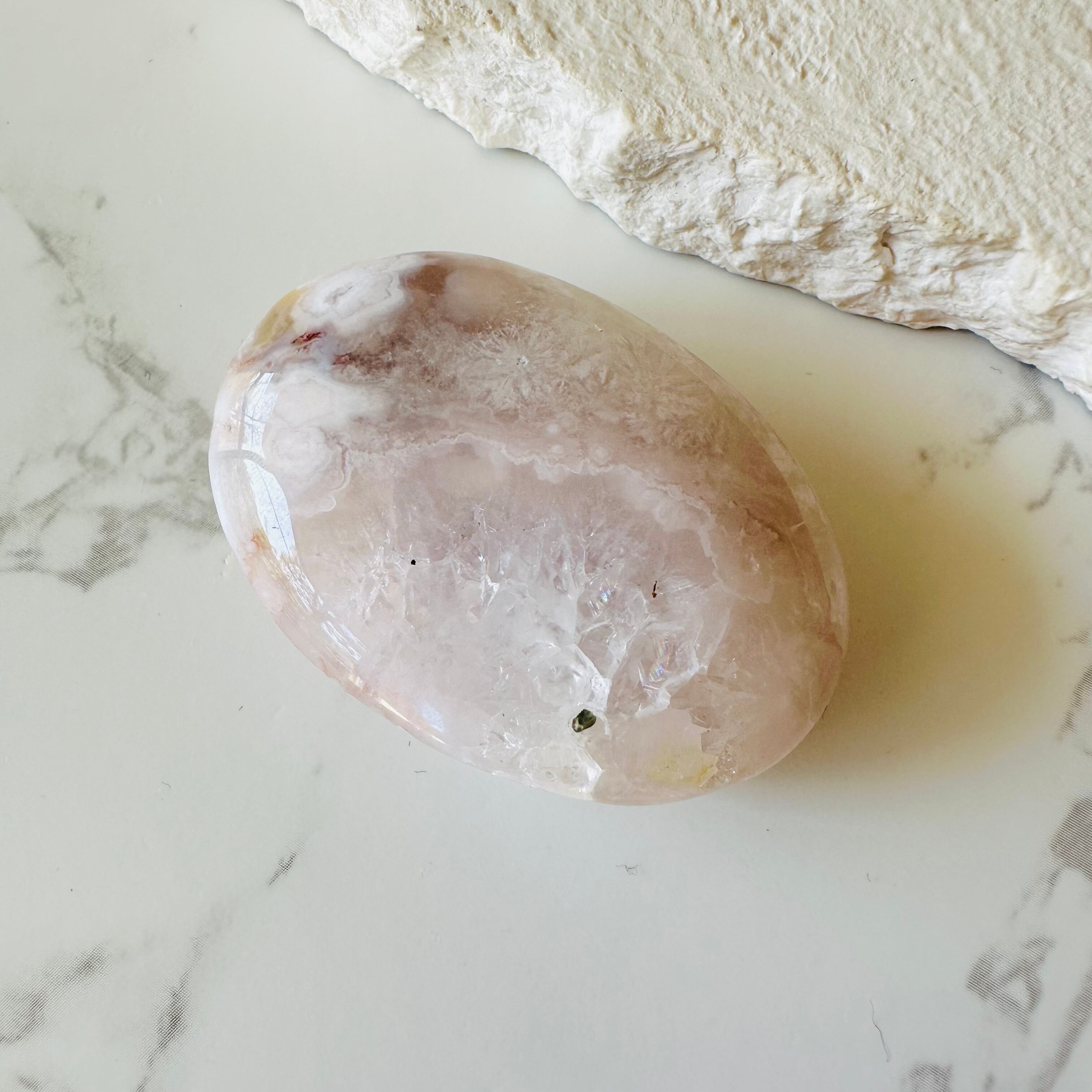 フラワーアゲートとピンクアメジストが共生したしたパームストーンです。