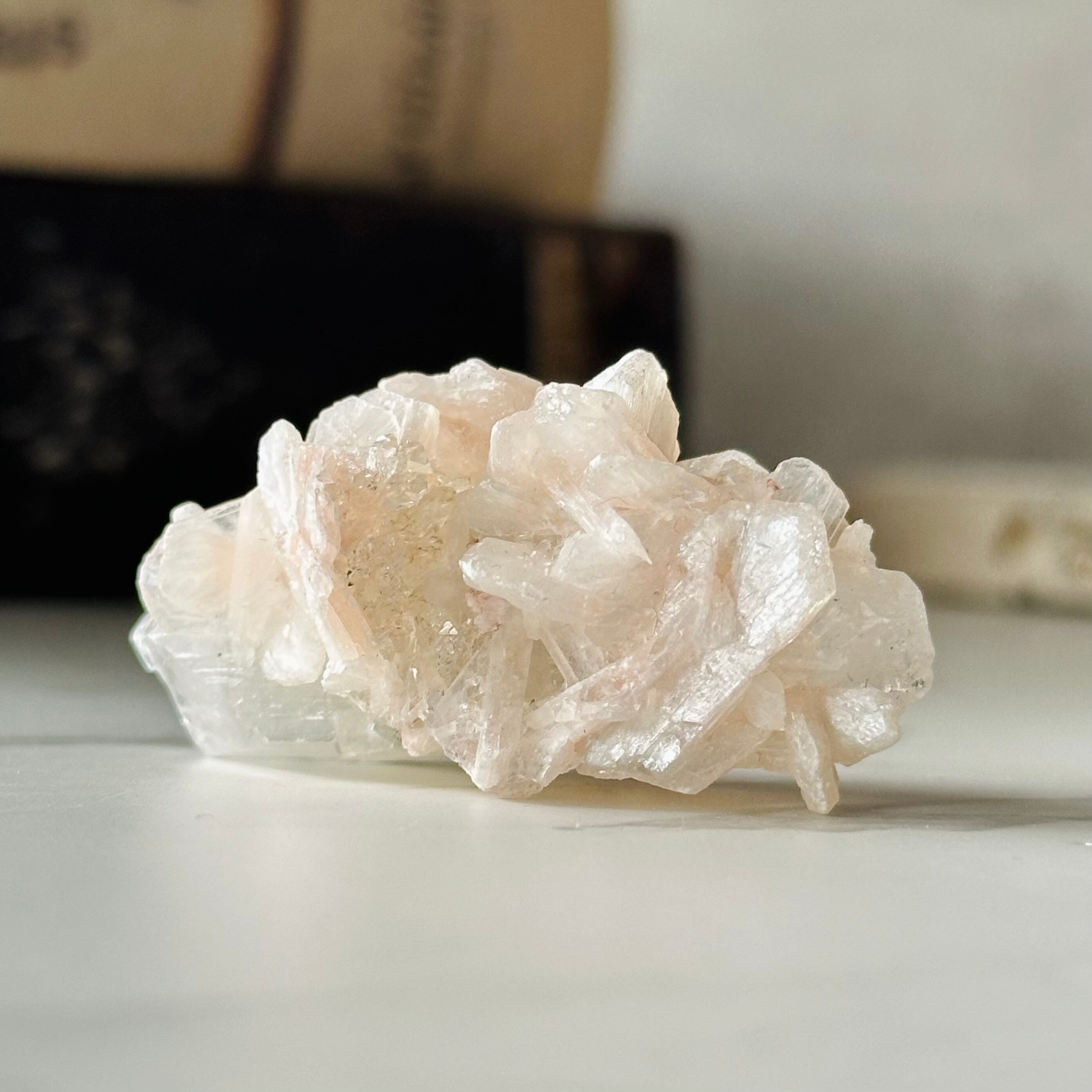 アポフィライトの表面にびっしりとスティルバイトが共生しており、淡いピンク色の結晶はヒラヒラ可憐な花びらのようです。女性らしいとても可愛らしいクラスターです。