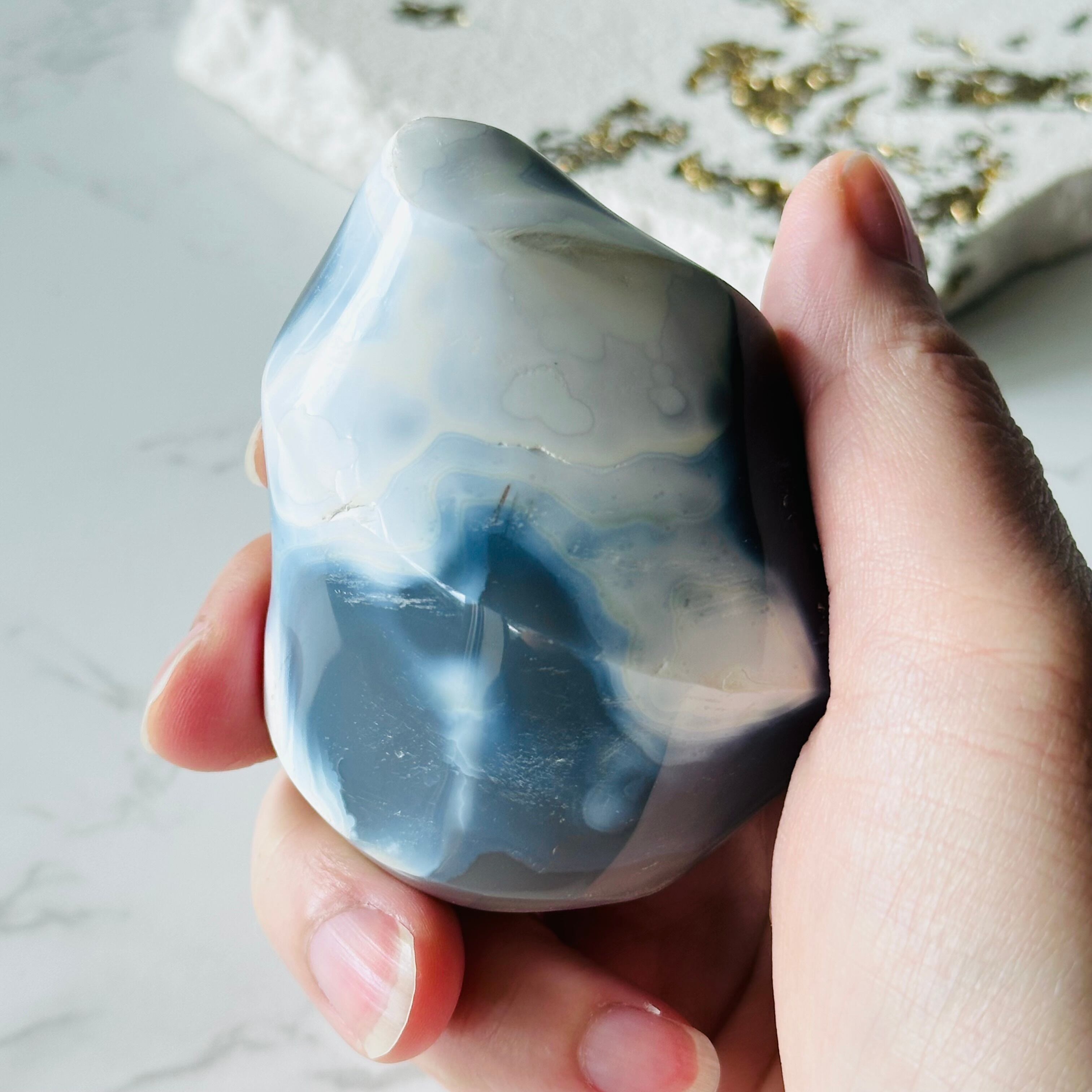 オルカアゲートはシャチのような見た目(色・模様)からその名がつけられました。自分自身と深く向き合う為のサポートをしてくれると言われます。心の傷を癒し、内面の平和と落ち着きをもたらす天然石です。また、海の記憶を宿し、地球の叡智を持つとも言われます。