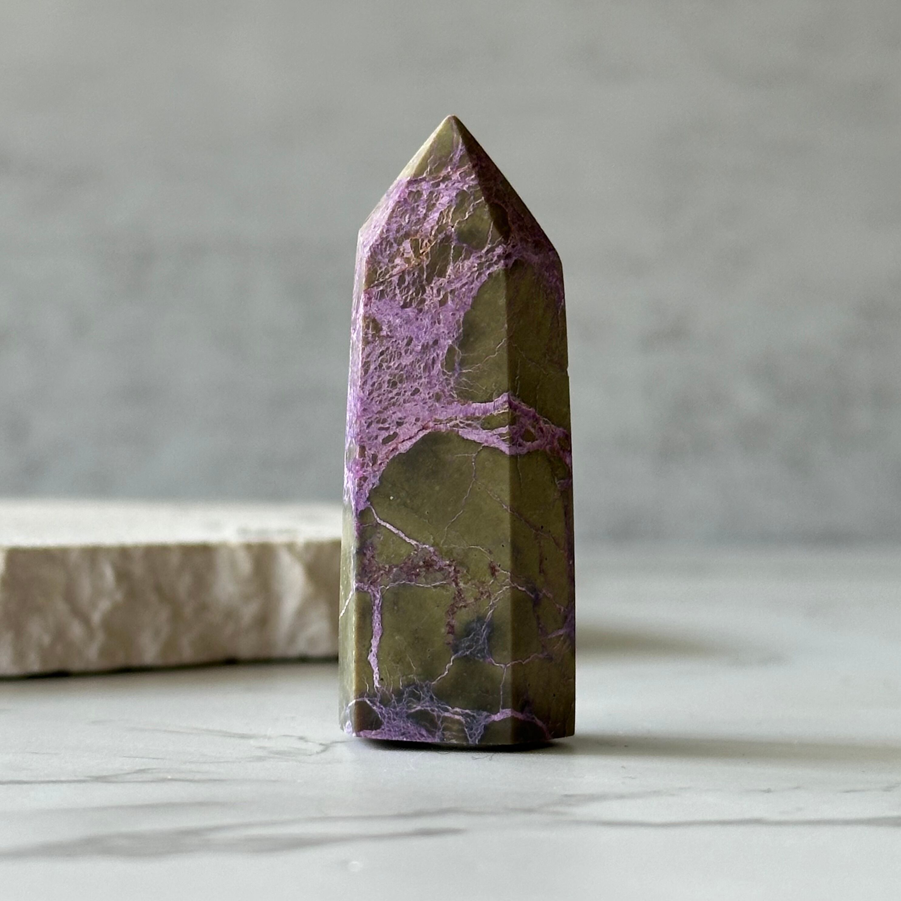 落ち着いたオリーブグリーンと、ワインのような紫色が混ざり合い、優しさと個性を併せ持った石です。私たち日本人の心にしっくりと馴染む、どこか「和」を感じさせる佇まいです。