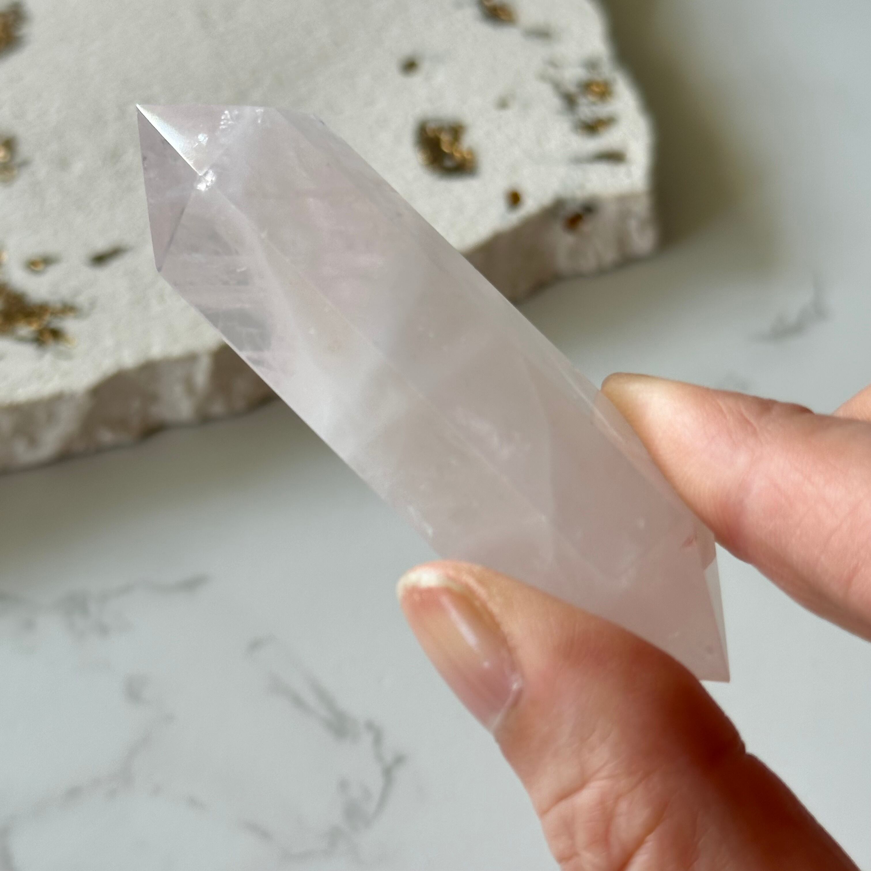 オーラを放つ美しいローズクォーツのダブルポイントです。柔らかなピンク色が心を和ませ、温かいエネルギーを感じさせてくれます。
