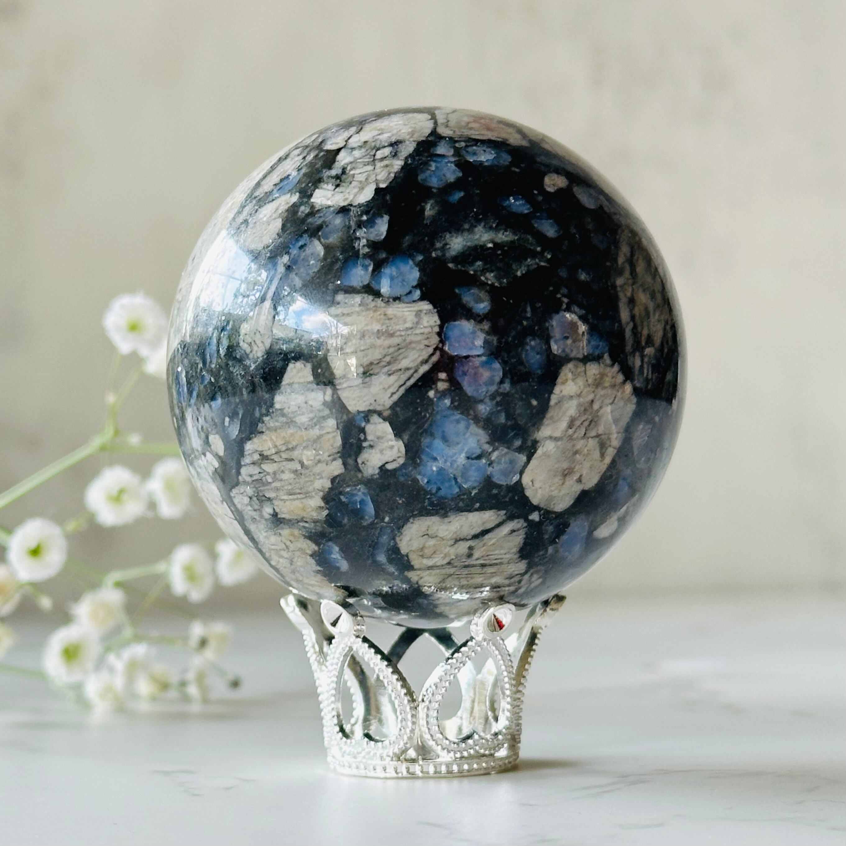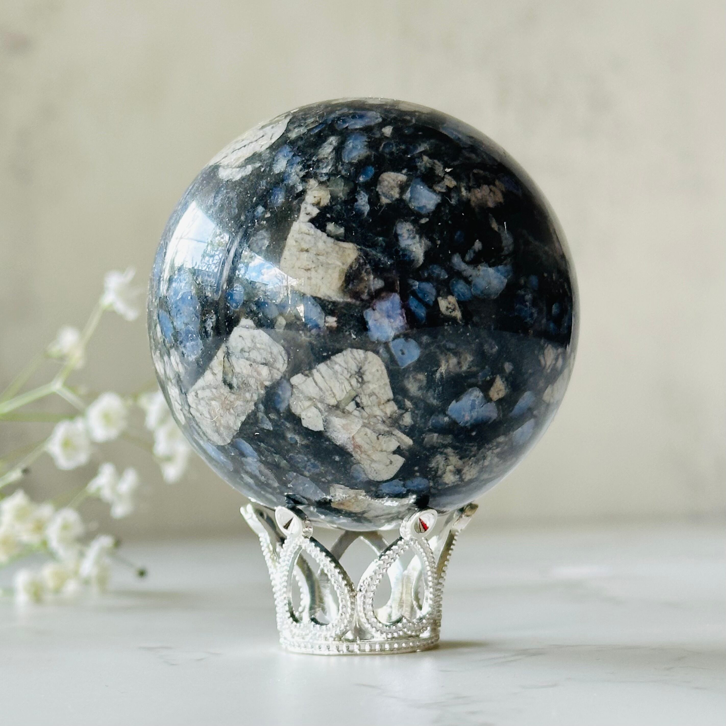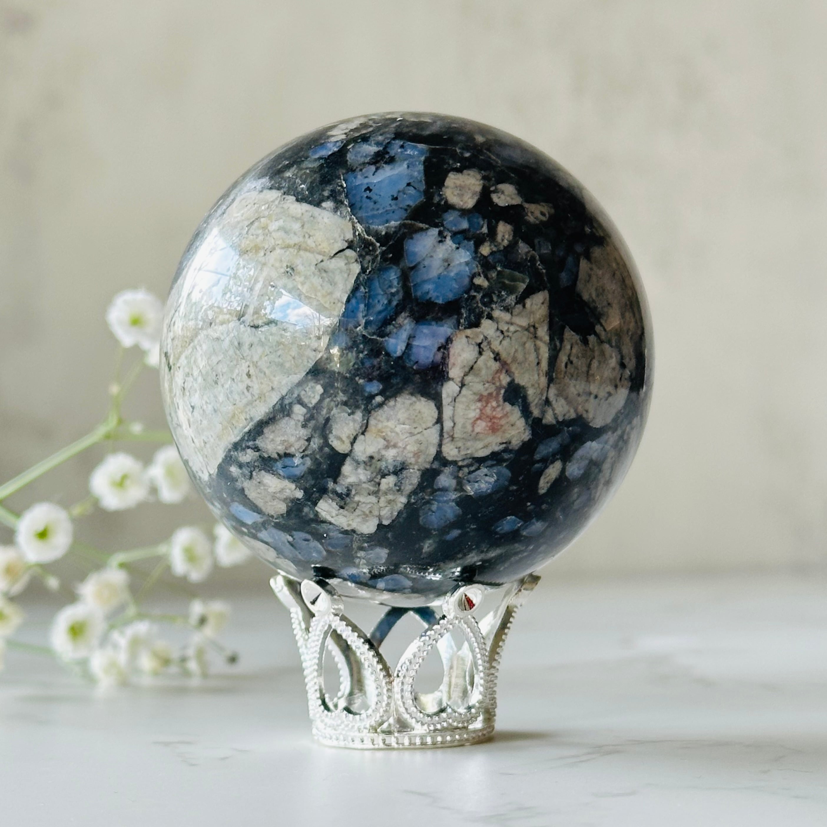 コングロメレイトと呼ばれる混合結晶石の流通名です。ブルーオパール、カルサイト、カオリナイト、クリノゾイサイト、マグネタイト、斜長石などいくつかの鉱物が混じりあった混合石で、さまざまな鉱物が混ざりあうことで生まれる不規則な色合いやパターンが魅力の美しい天然石です。